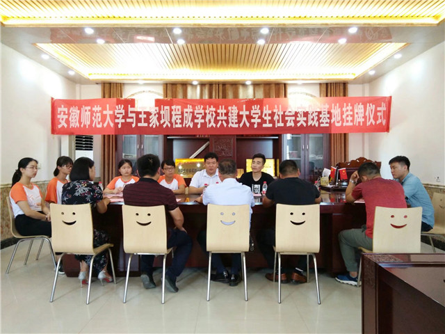 大学生暑期社会实践基地挂牌仪式在安徽省阜南县王家坝镇程成学校举行。出席此次会议的有王家坝镇镇长余海阔,中心学校校长张云亮,程成学校校长程涛,安徽师范大学化材院团委书记蒋建伟,辅导员代表王国良、王雨兵及志愿者代表等。本次仪式由辅导员代表王国良主持。