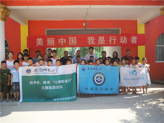 大会的开始,由余海阔镇长和蒋建伟书记共同为社会实践基地挂牌揭幕,宣布安徽师范大学大学生社会实践基地正式成立。首先,由实践团队志愿者代表向与会的领导们汇报了实践近期工作以及个人心得分享。随后,安徽师范大学化材院团委书记蒋建伟书记发表讲话,希望志愿者们走到实践中去,有所感悟,有所思考,将实践和服务转化为对别人的帮助,期待大家在社会实践中实现自我的成长,满载收获而归,同时表示感谢校方对我院学生实践活动的大力支持。余海阔镇长在最后的总结发言中说到,感谢我校支持王家坝镇教育扶贫工作,志愿者们如同一阵清风,给王家坝的孩子们带来了知识与欢乐,随即介绍了王家坝镇的教育经济现况,以及王家坝精神。仪式的最后,程成学校校长,王家坝镇镇长,孩子们与我院领导亲切合影留念。