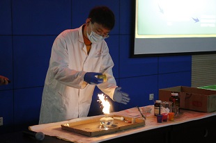 决赛现场,解说者思路清晰,表达流利;操作者聚精会神,配合默契;在场观众屏息凝视,受益良多。实验《神奇纸片》用化学画笔描绘了七彩的温馨祝福;实验《碘钟反应》以课堂教学的形式,向观众展现颜色循环变换的过程,在实验现象中揭示了周而复始,生生不息的深刻哲理;《显色师大》利用白蓝色彩转变,把师大的90年的变迁展现在纸片之上,设计别出心裁,令人耳目一新;《火山爆发》则用幽默的讲解,生动的现象,引起了场上观众阵阵惊叹;《美丽的铜片灯》与《火树银花》带动观众一同感受化学的奇妙,神奇的灯光、迸射的火花、瑰丽的色彩,统统交织在眼前,给观众带来了一场视觉上的饕餮盛宴;《魔壶》《神奇的火焰树》同魔法一般在眼前变换,尽显化学的奇妙与趣味。最终,经过评委打分认定,来自皖江学院的吴明涛、吴倩玲同学的实验《火树银花》与卡通色情