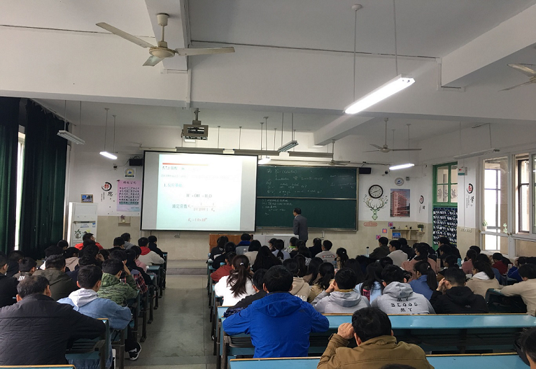 (本网讯 陆陈鑫)4月10日上午,陈红旗老师在2010308教室进行了公开课《酸碱滴定原理》,2018级应用化学专业全体学生、学院多位教师共同聆听了此次课程。