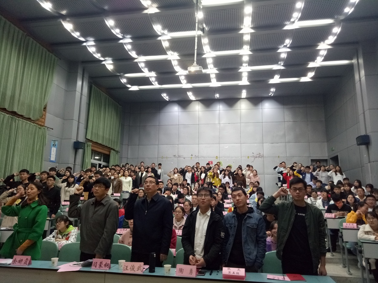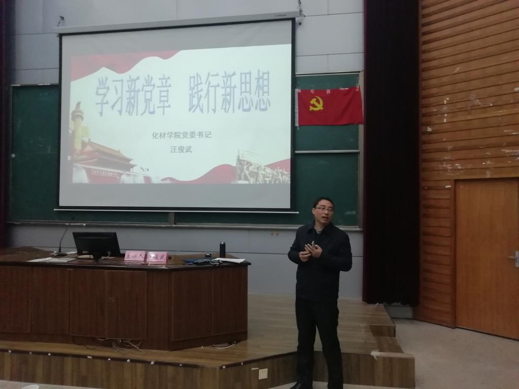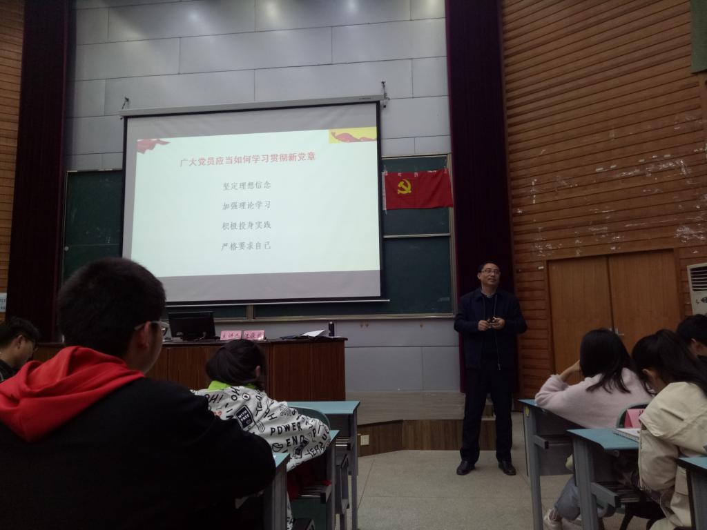 开班仪式后,学院党委书记、分党校校长汪俊武书记为全体学员作了“学习新党章,践行新思想”报告。在讲座中,首先,汪书记以严谨的语言与大家讲述了党章的基本知识与历史演变,他指出中国共产党自1921年诞生至十九大共产生一部党纲、18个版本的党章文本;此外,汪书记着重向全体学员讲述了十九大党章修改的内容及其意义,他指出十九大党章将习近平新时代中国特色社会主义思想、中国特色社会主义文化等10个方面的内容写入党章,并指出十九大党章修改的意义是重大的,它彰显了新时期党的道路自信、理论自信、制度自信、文化自信,新党章是推动全面深化改革各项事业有序发展、擘画中华民族伟大复兴的宏伟蓝图,体现了全党意志、符合时代要求、顺应党心民心。随后,汪俊武书记以诙谐幽默的语言并结合自身实际与全体学员们分享了党章的学习方法。他指出,要“逐句学”,逐条逐句通读党章;要“对照学”,与以前的党章相对照;要“结合学”,与十九大报告相结合,与党的初心与使命相结合,与自身思想实际相结合,与自身岗位职责相结合。