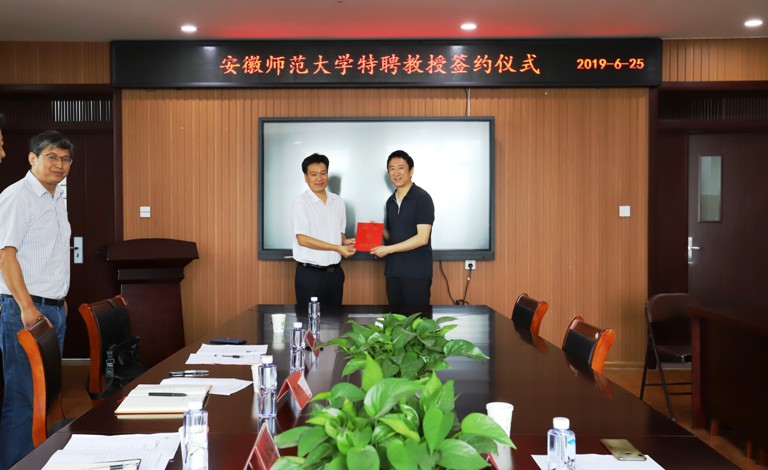 礼勤楼702会议室举行特聘教授签约仪式。美国拨云制药有限公司首席执行官、首席科学官,中国拨云生物医药科技(广州)有限公司首席执行官倪劲松博士被聘请为安徽师范大学特聘教授。校党委常委、副校长毕明福,校人事处处长朱为民,卡通色情