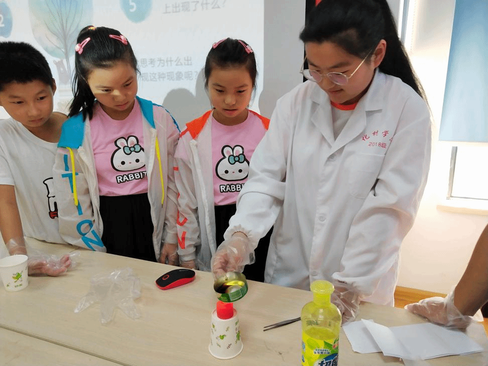 今天的授课活动,一共有三名志愿者为小朋友们带来科学小实验,分别是刘晶晶同学的“显露的指纹”、唐文君同学的“漂浮的针”、路振龙同学的“烧不坏的手帕”。