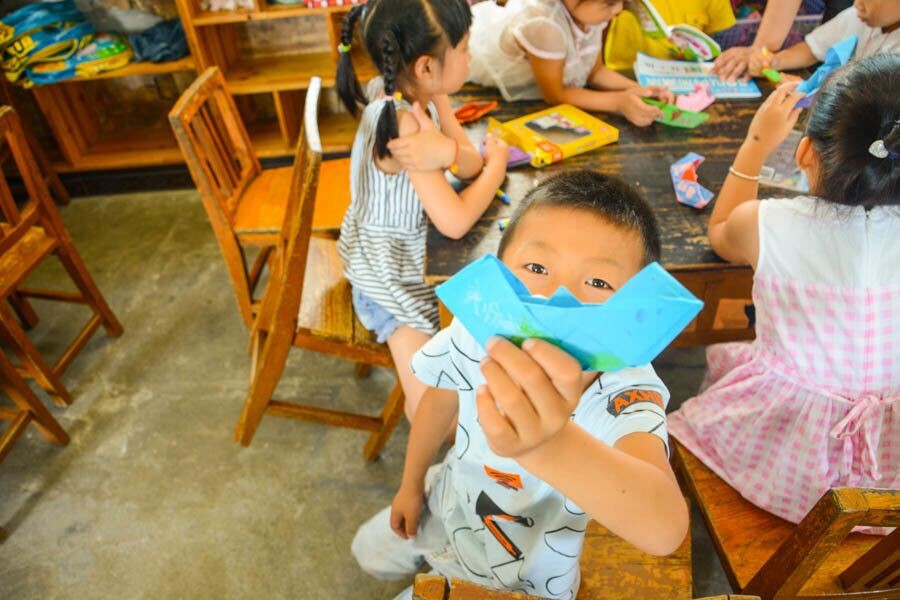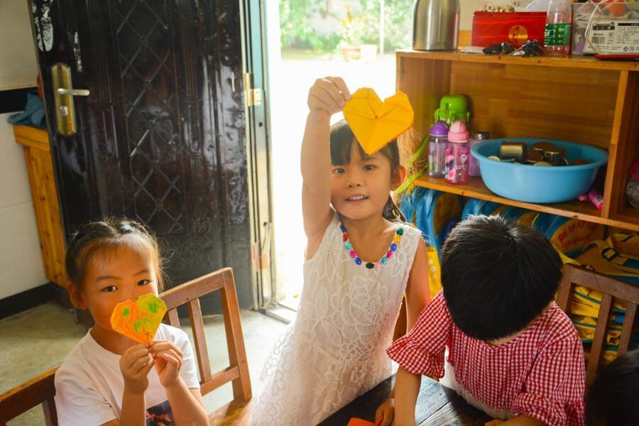 我们将孩子们分成五组,给孩子们依次分发了各种颜色的卡纸,一步一步,手把手带着孩子们体会折纸的技巧与魅力。在一双双小手的翻折下,一颗颗五颜六色的爱心,一只只乘风破浪的小船,一盏盏圆圆润润的灯笼逐渐出现在我们眼前。接着孩子们用蜡笔在折纸上画画,涂色。