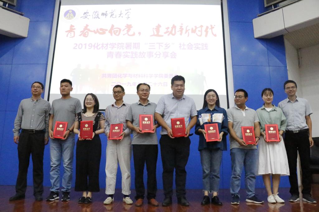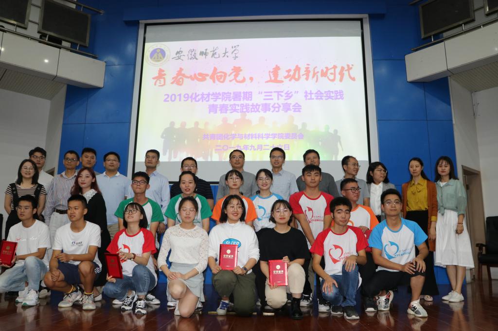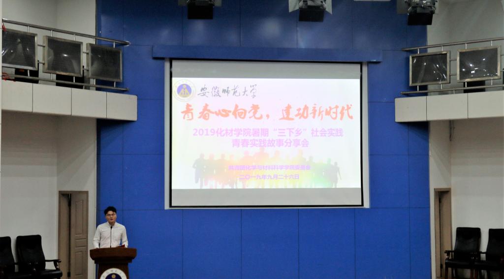 精心组织了37支实践团队,共494名青年学子奔赴江淮大地,以“五四先锋团、专业实践团、环保宣教团、爱心服务团”四大类主题全面开展科普宣传、专业见习、环保宣传、志愿服务、爱心支教、社会调研等实践活动。9月26日下午,为总结经验,展示成果,学院举行了“青春心向党,建功新时代”2019年大学生“三下乡”暑期社会实践——青春实践故事分享会。学院创新创业基金资助单位代表马鞍山锐生工贸有限公司副总经理何振铿、营销总监张立,校团委副书记汪凯,学院领导班子成员、优秀指导教师代表及全体辅导员参加分享会,2019级400多名大一新生参会聆听,会议由院团委书记陶勇主持。
