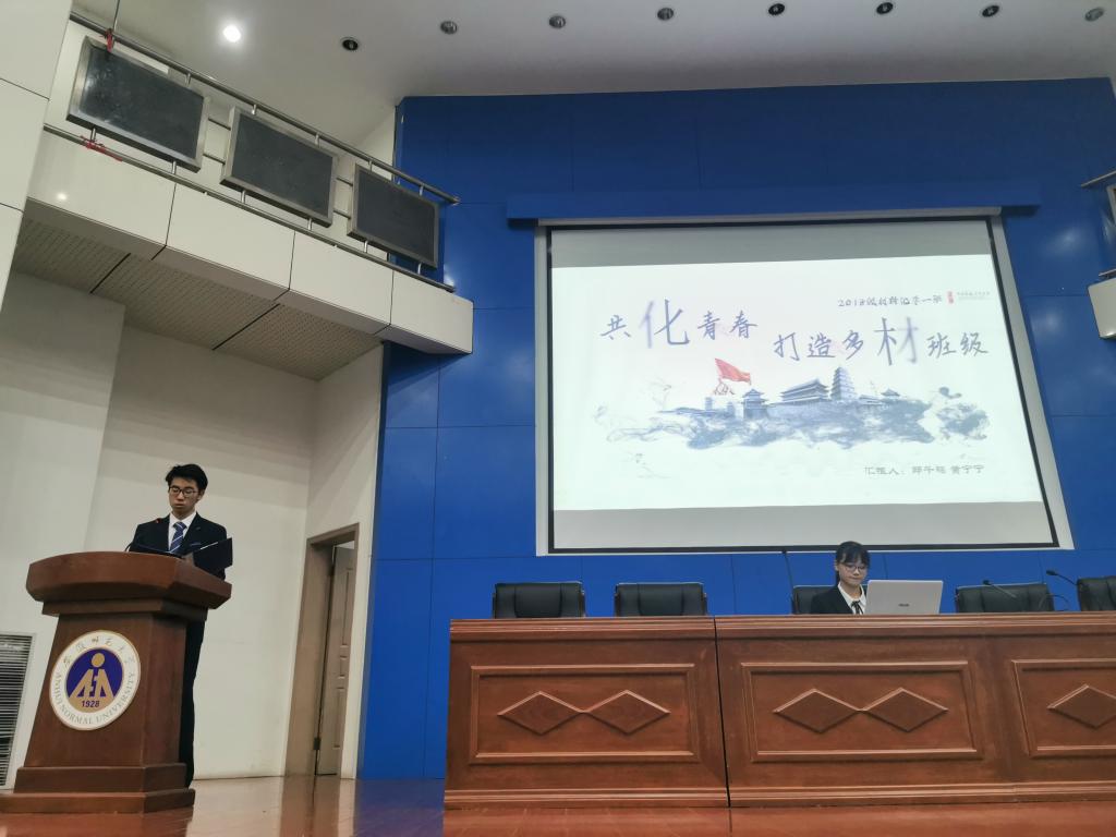汇报会上,各班级代表根据抽签顺序依次上台进行汇报,通过PPT、视频等多媒体手段图文并茂地展示了本班班级在班级制度、思想教育、班级文化、班级活动以及团组织建设等方面的各项成果,各班级通过列举具体的班级建设数据、再现了班级活动的生动图片、温情诉说班级成长的一点一滴,展示了各班级集体和同学个人在班级组建和建设过程中的发展和成长。