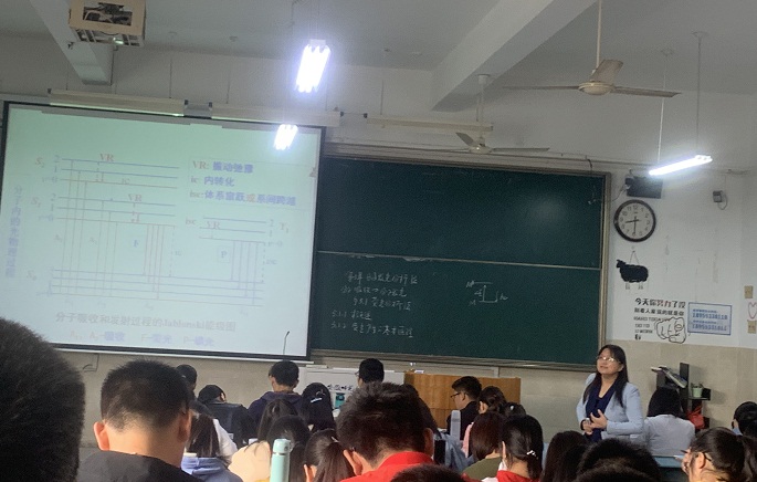 张明翠首先通过教学导读介绍了本章的学习内容,用结构图为我们呈现了光学分析法的分类。接下来,张明翠借助生活中的实例:萤火虫发光、晚会活动用的荧光棒等,引入了本节课的主要讲述内容分子发光分析法——荧光分析法。分子荧光分析法就是根据物质的分析荧光光谱进行定性,以荧光强度进行定量的一种分析方法。正所谓知其然知其所以然,为了让大家能够更好的掌握荧光产生的基本原理,张明翠给同学们留了几分钟时间去观察能级图,并思考相关问题。此后荆雷、张思雨两位同学积极举手发言,谈了自己的想法。张明翠也对同学的回答进行了点评,最后详细地为我们讲解了荧光产生的基本原理,使我们对这一概念有了更深刻的理解。