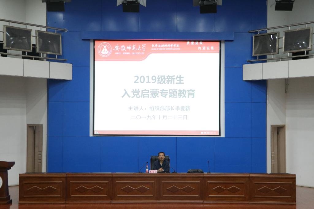 举办了2019级新生入党启蒙专题教育,校党委常委、组织部部长季爱新老师应邀为同学们作专题教育讲座。院党委副书记余妍霞、新生辅导员陈静、段传钦与19级全体新生聆听了此次讲座,讲座由余妍霞主持。