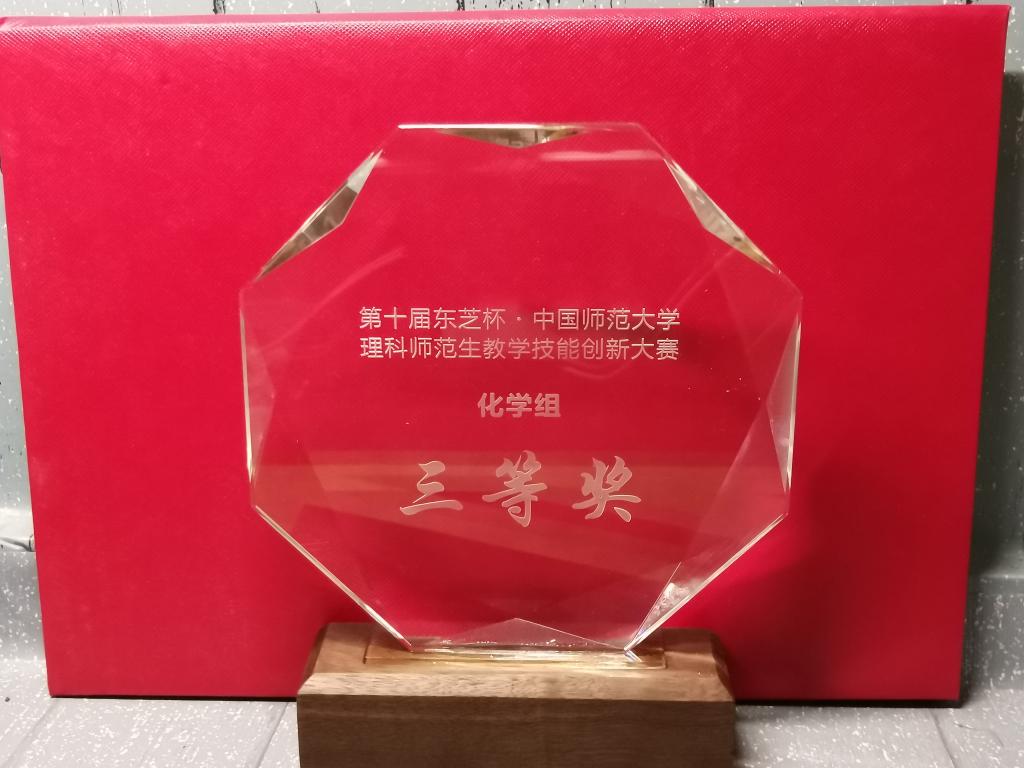 周冬冬/王磊)12月24日~27日,由教育部和东芝(中国)有限公司主办的第十届东芝杯•中国师范大学理科师范生教学技能创新大赛在贵州师范大学举行,来自全国50所师范大学的145名师范生分数学、物理、化学三组进行竞赛,每组设一等奖1名,二等奖3名,三等奖6名。决赛设有教案设计、即席演讲、模拟授课、现场提问四个环节。经过激烈角逐,我院2017级师范生王磊同学斩获得化学组三等奖,创造了我院学生在此项赛事中的最好成绩,实现我校东芝杯大赛的历史性突破。