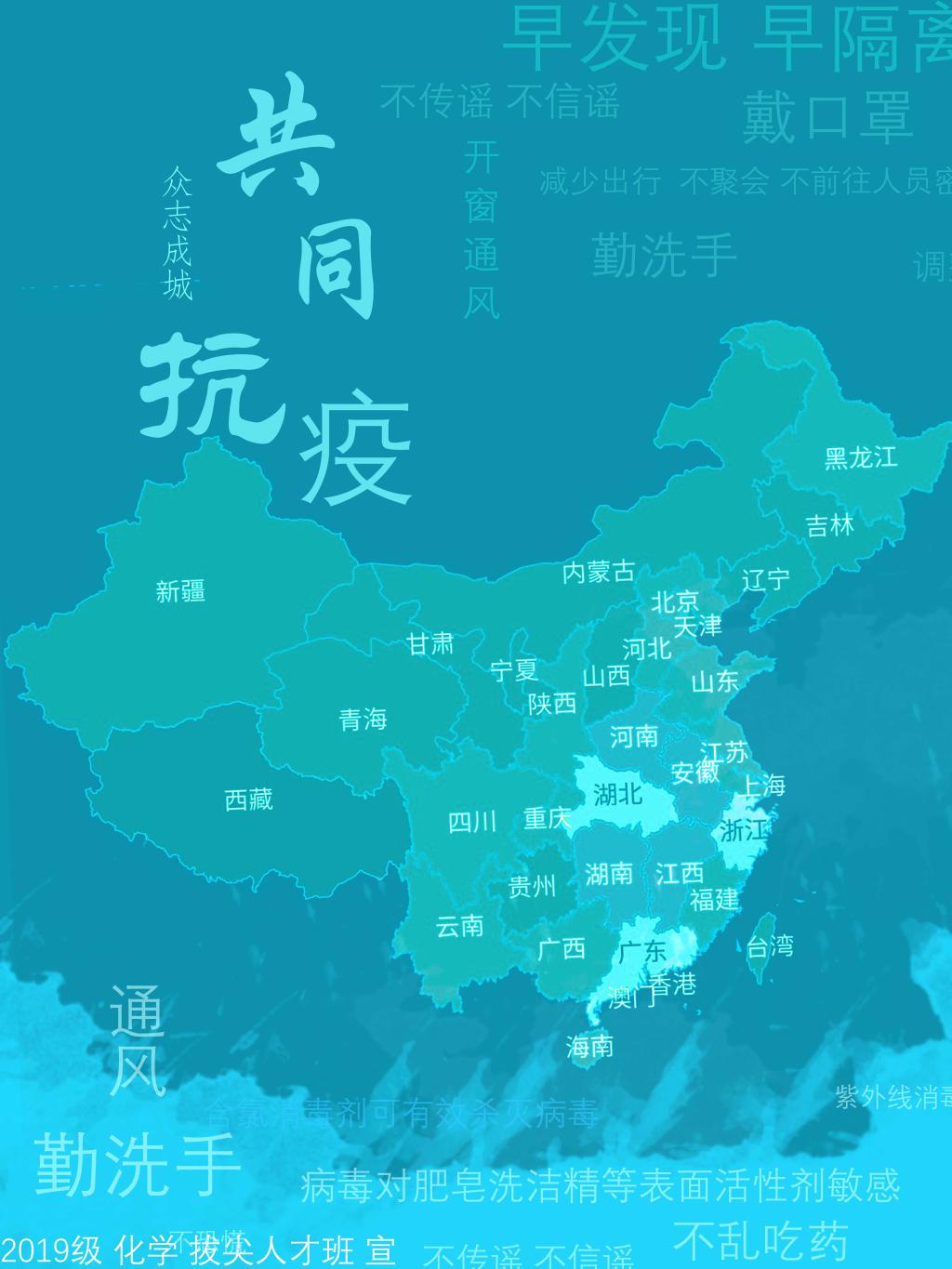 轻触笔尖以“艺”抗疫,化材学子携手共战。在抗击新冠肺炎疫情的战役中,化材学子虽不能冲上一线与病毒抗争,但始终心系前方疫情。我院积极发动青年先锋,以班级为单位,为武汉传递爱与温暖。青年学子全员行动,用手写文字传递祝福,共克时艰;用海报的形式礼赞英雄,传达敬意;用电子“微板报”形式宣传疫情知识,提高认识;用自制视频的形式传递满满正能量,为武汉加油。抗击疫情你我共行,防疫攻坚众志成城。大家随身处各地,但心系一处,相信病与伤痛终将逝去,企盼共迎春暖花开。