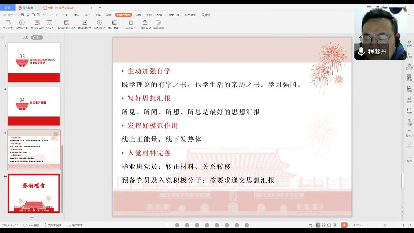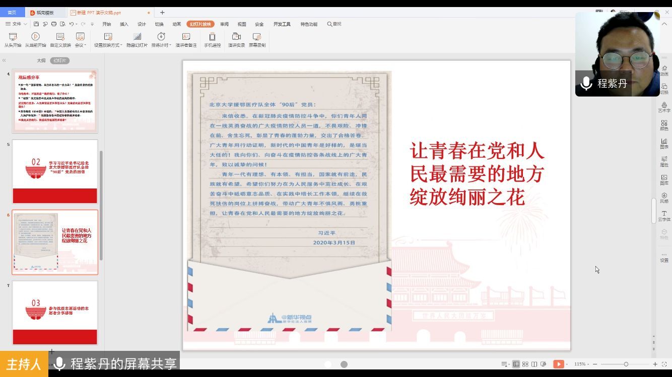程紫丹结合志愿分享,强调大学生党员要有朴素的民族担当、坚定的信念以及敢于面对风险的勇气,要在历史事件中有所沉淀、有所思考、有所行动。他对表示,党员要主动加强自学,发挥模范作用,争做发热体,传递正能量。