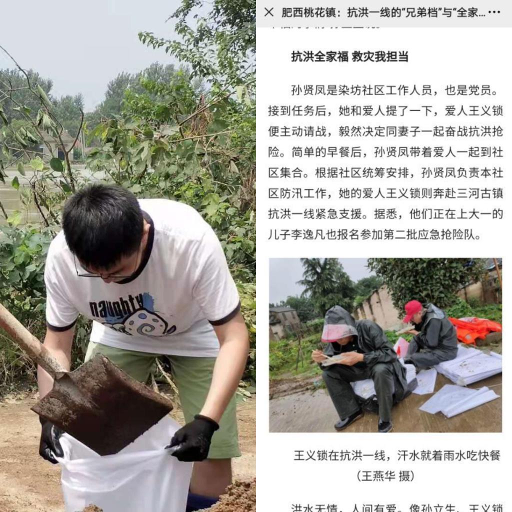 青年学子积极响应各地志愿防汛救灾号召,投身其所在地防汛救灾志愿服务中,用自身实际行动诠释了“奉献、友爱、互助、进步”的志愿精神,彰显化材青年学子的先锋模范作用。