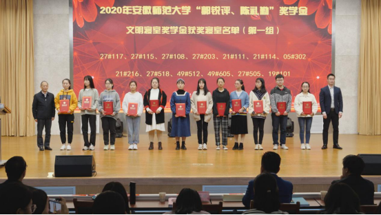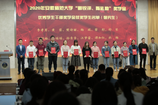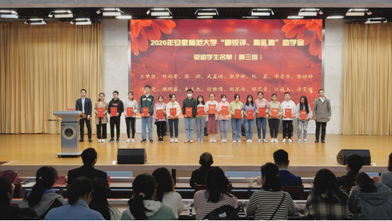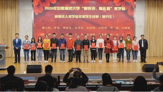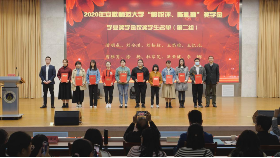 颁发典礼在庄严的国歌声中拉开序幕。活动伊始,贡植斌宣读了安徽师范大学2020年“郭锐评、陈礼勤”奖助学金颁发决定。随后,芮彬云先生、张池先生和现场嘉宾分五个批次向获奖受助学生颁发奖助学金。2017级化学师范专业王磊同学和2017级材料化学专业陈柔同学分别代表获奖、受助同学发言,两位同学对郭锐评女士、陈礼勤博士的无私资助表达了诚挚的感激,并向学校、学院的关心表达了深深的谢意。两位同学表示,“郭锐评、陈礼勤”奖助学金的颁发不仅给他们带来物质上的帮助,更让他们感动于郭锐评女士、陈礼勤博士情系母校、感恩母校的大爱情怀,使他们在精神上深感温暖,深受鼓舞,两位同学纷纷表示将不辜负这份爱的期盼,用更加优异的成绩来回报郭锐评女士、陈礼勤博士及学校学院给予的关心和帮助,将来努力让这份大爱之心和奉献精神传递下去。