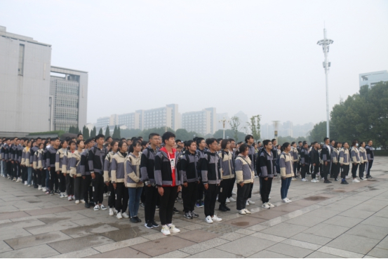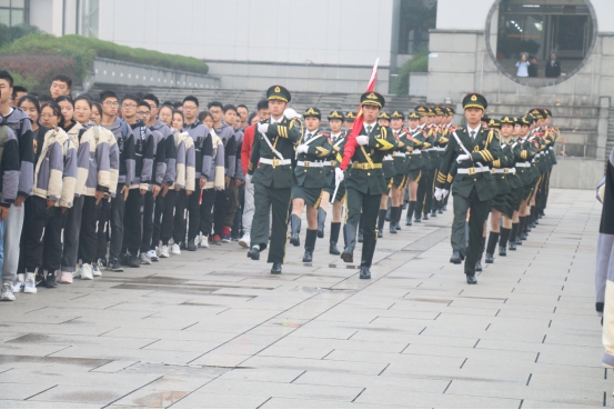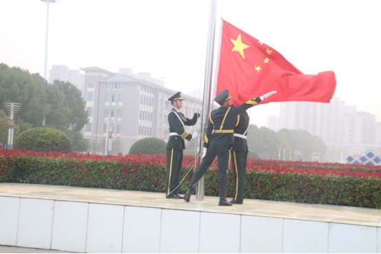 于本周一早晨举行了校园升国旗仪式。学院党委副书记余妍霞,人武部国防教育科科长蒋建伟,学院2020级新生辅导员,国旗护卫队升旗护旗队员和学院全体2020级本科生共同参加了本次升国旗仪式。