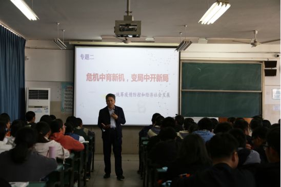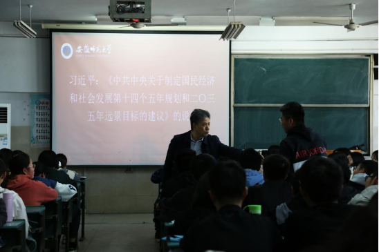 陆林教授以当前的社会现实作为出发点,在与同学们的亲切交谈中,深入分析国际国内形势,详细阐述了在统筹疫情防控和经济社会发展方面国家如何在危机中育新机,变局中开新局。结合第十九届中央委员会第五次全体会议的学习,陆林教授向同学们详细解读了《中共中央关于制定国民经济和社会发展第十四个五年规划和二〇三五年远景目标的建议》,通过启发和互动的方式,帮助学生深刻领会了在当前我国发展环境面临深刻复杂变化的情况下,全面建成小康社会所取得的决定性成就,深刻认识我国进入新发展阶段的重大意义、有利条件和重要特征。课堂中,陆林教授结合当前经济社会发展的现实问题,深入分析了“十四五”时期我国发展的指导方针、主要目标、重点任务,2035年远景目标以及构建新发展格局的战略构想和重要着力点。勉励同学们要坚定理想信念,厚植爱国情怀,加强品德修养,增长知识见识,培养奋斗精神,增强综合素质,为实现‘十四五’规划和2035年远景目标而努力奋斗,积极主动成为新时代中国特色社会主义合格建设者和可靠接班人。