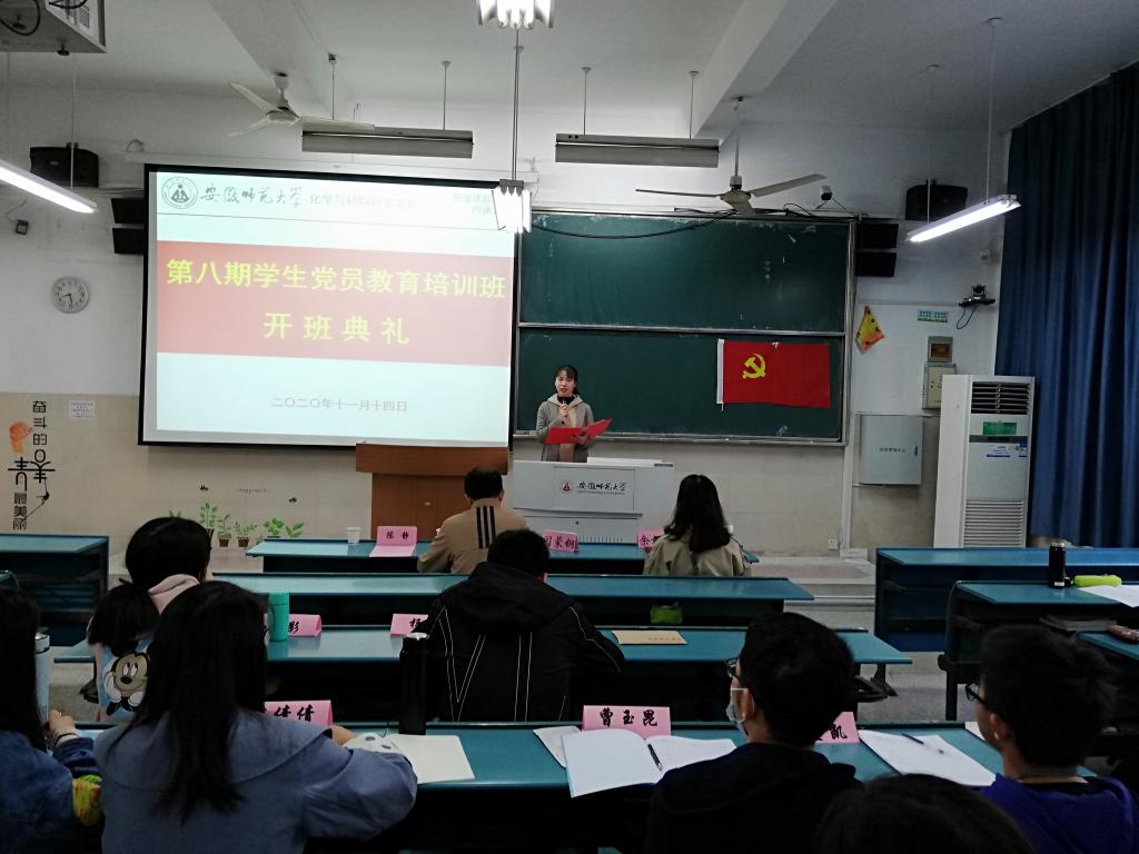 典礼在庄严的国歌声中拉开序幕。闫蒙钢向全体学员宣读了学院党委关于同意举办第8期党员教育培训班的文件以及培训班班委会的任职安排。陈静对本期党员培训班班委会工作制度、考勤制度、学习制度、考核制度、评优制度等班级管理制度进行了详细的解读。2017级化学师范专业石心怡同学作为学员代表发言,她号召青年党员同学要不忘初心、牢记使命,时刻以党员的标准严格要求自己,在日常的学习、生活和工作中努力争做先锋模范,为实现中华民族伟大复兴的中国梦贡献党员的青春力量。余妍霞在动员讲话中指出,学院党校是培养培训青年马克思主义的重要阵地,也是优秀青年学生深入学习党的基本理论知识、强化理想信念教育,了解中国共产党、认识中国共产党的生动课堂。她希望全体学员珍惜学习机会,用心学习,把学习培训作为重温经典的读书会;强化入党动机,深入学习,把学习培训作为锤炼党性的精神高地;严守纪律要求,认真学习,把学习培训作为领会初心使命的生动课堂。开班仪式上,全体党员还共同重温了入党誓词。