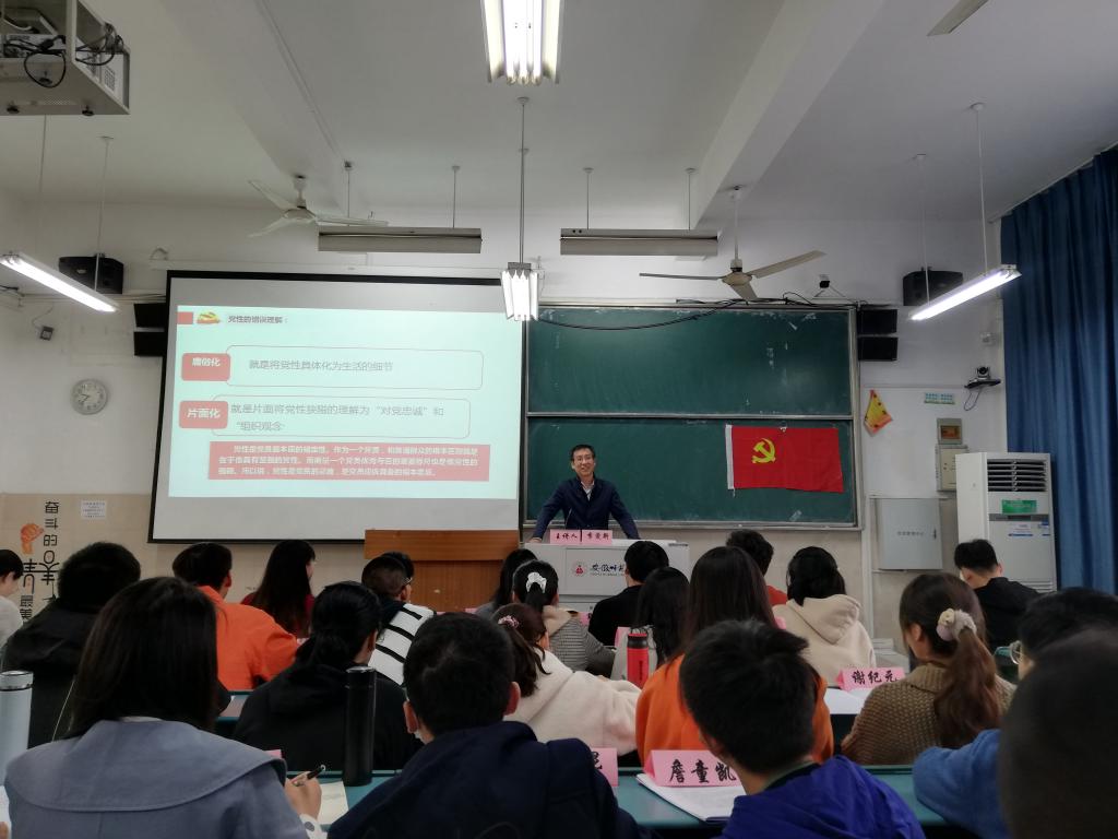 开班仪式后,校党委常委、组织部部长季爱新老师为全体学员作“新时期共产党员的党性修养”专题报告。季部长从鲜活的历史事突出发,通过讲述革命前辈刘少奇同志的经典著作《论共产党员的修养》和党性修养楷模周恩来同志的光荣革命事迹,向同学们深入浅出地阐释了什么是党性修养、党性修养的主要内容以及如何加强党性修养,为青年党员同学提升党性修养开启了一扇明窗。