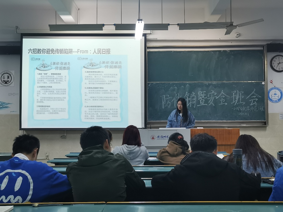 各年级、各班召开反传销主题班会。班会中,各班负责人带领班级同学学习反传销相关知识,结合自己身边的真人真事,为同学们讲解了传销的危害。同时从传销组织的运行特点着眼,介绍了传销的辨别与防范方法,并且为同学们讲述了进入传销组织后的自救实例,积极引导同学进行自我教育、自我管理、自我服务、自我监督,增强对传销的免疫力。会后,班级同学联名签署了《“净化校园,拒绝传销”承诺书》,承诺加强反传销防范意识,不参与、不宣传传销活动,对身边发生的传销活动做到及时发现、敢于揭发,共建和谐校园。