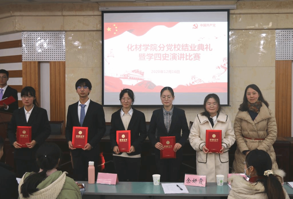 在庄严的国歌声中,结业典礼正式拉开序幕。首先,培训班班主任陈静对本学期党校工作进行总结,宣读了2020年度分党校优秀学员名单,并由领导老师为优秀学员颁发证书。随后,进行了党校培训班的成果展示——“学四史 守初心 担使命”演讲比赛。本次比赛经过前期初选,共推荐10名选手参加决赛,这10名决赛选手中,有刚发展的预备党员、有入党积极分子,也有进校后刚递交入党申请书的大一新生。比赛中,参赛选手用声情并茂的演讲,讲述了党和国家在发展中生动感人的事例,将典型人物和鲜活故事以“身边人讲述身边事”的形式娓娓道来。一个个鲜活的场景,一幅幅感人的画面,一次次深刻的思想感悟,让观众深深地为之触动,掌声不断。会后,学院领导前往学生宿舍,为党员寝室挂牌、亮身份,叮嘱党员们要做好表率,处处发挥先锋模范作用。