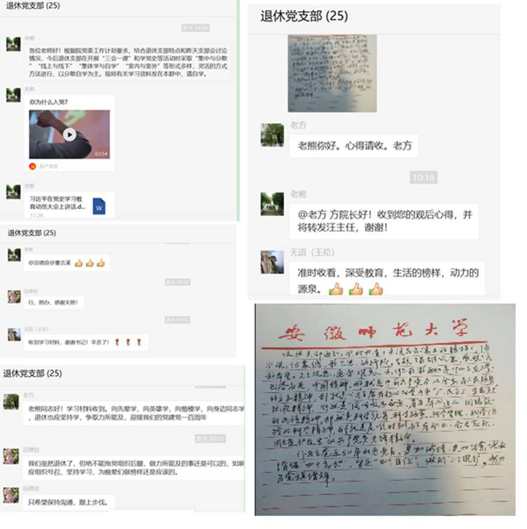 结合老同志集中相对困难的情况,通过建立党支部微信群,以线上学习、开展活动为主,安排专人及时推送学习材料和相关文件通知,组织老同志线上参加学院党委集中学习,组织老同志开展线上学习讨论交流,注重线上线下相结合,扎实推进党史学习教育。
