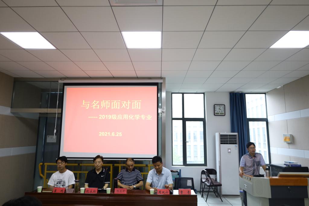 应用化学系于6月25日下午在实训中心三楼多媒体教室组织召开了“与名师面对面——应用化学专业师生座谈会”。本次座谈会由应用化学系主任章青主持,学院副院长周双六、教授委员会主任杨高升、副主任倪永红和应用化学系教师代表崔鹏参加此次座谈会,参与此次座谈会的还有2019级应用化学专业全体本科生。