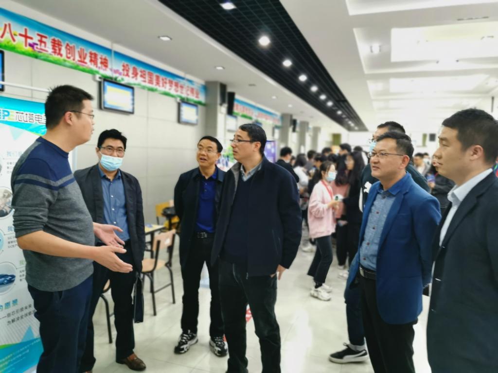 党委书记汪俊武、院长高峰、党委副书记李古州及毕业班辅导员深入招聘现场与合肥新站高新区人事劳动局人力资源服务中心副主任彭俊及用人单位亲切交谈,并指导学生们现场投递简历。