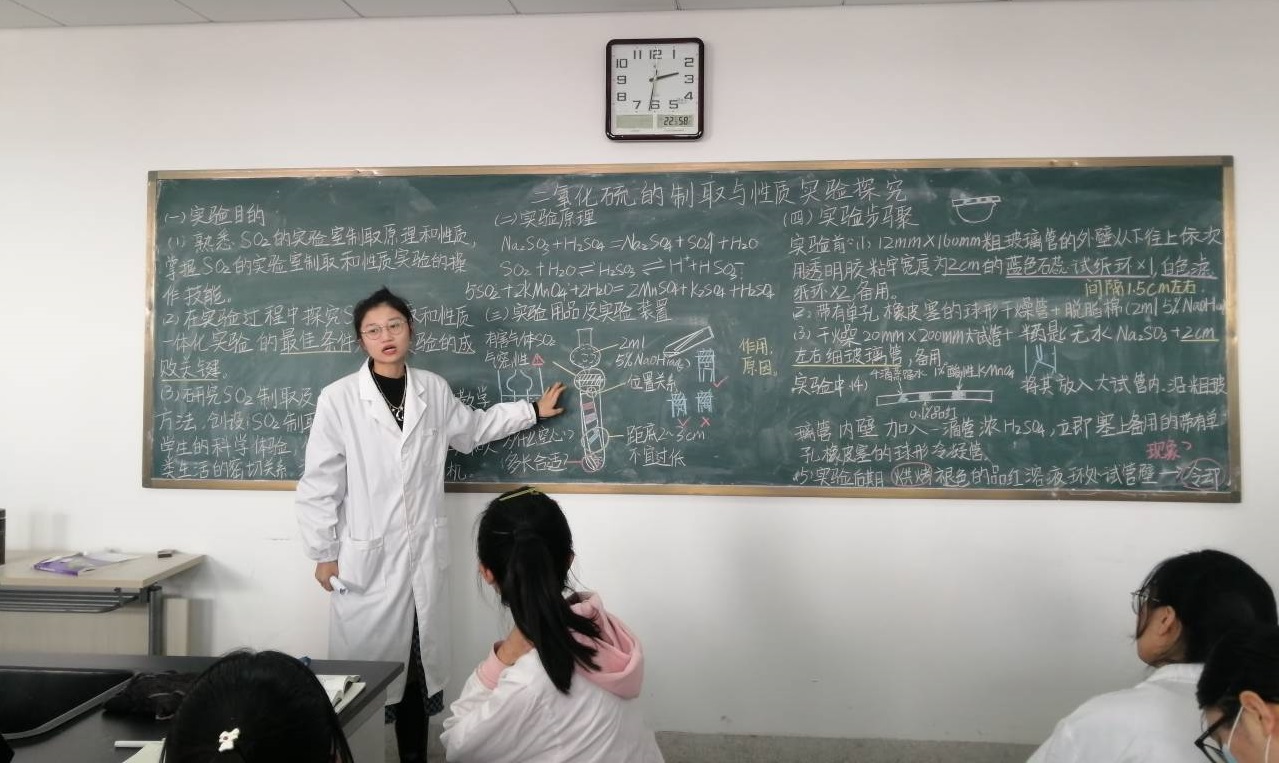 本科生周昱晨首先详细讲解了二氧化硫的制取、性质检验原理、实验装置与实验步骤,随后,阙老师对周昱晨同学的讲解进行点评与补充,提出了一些有利于同学们参考的讲解建议。此外,阙老师对本次的一体化创新实验装置进行了更加详细的讲解,引导同学们从实验仪器选取、气体检验步骤等角度理解与思考。同学们对本次实验有着很大的兴趣,认真聆听讲解,积极与老师互动。