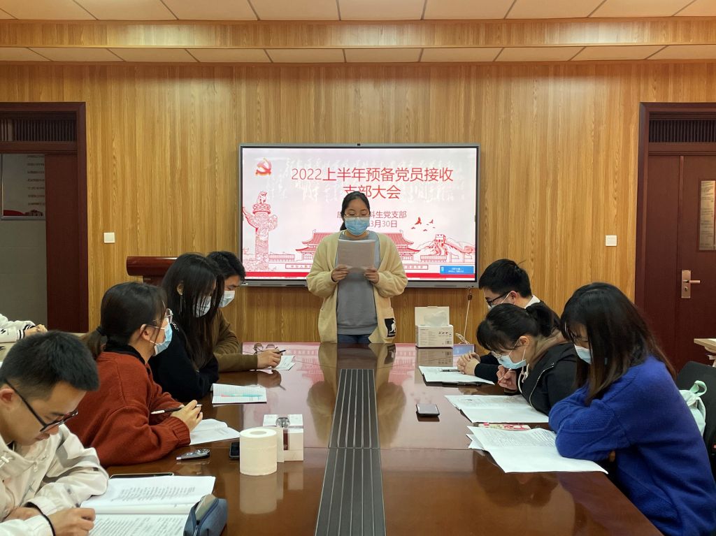 本网讯(应化系本科生党支部 鲁立一)2022年3月30日晚上7点,应化系本科生党支部在礼勤楼707室召开了2022上半年预备党员接收支部大会。应化系本科生党支部全体党员、预备党员、发展对象均按时参会,大会由党支部书记陶勇主持。