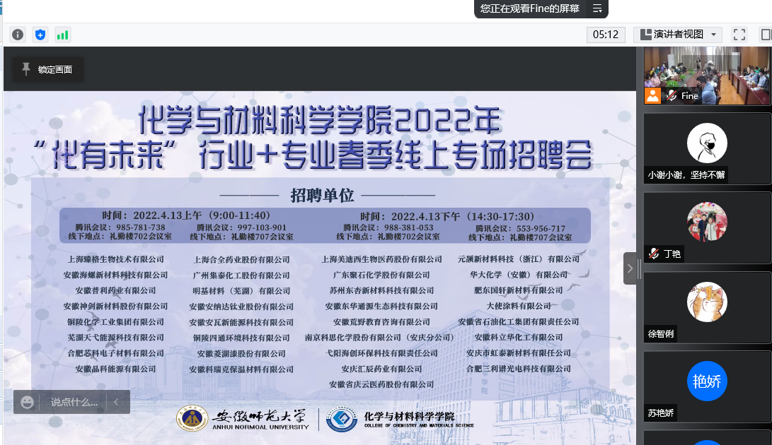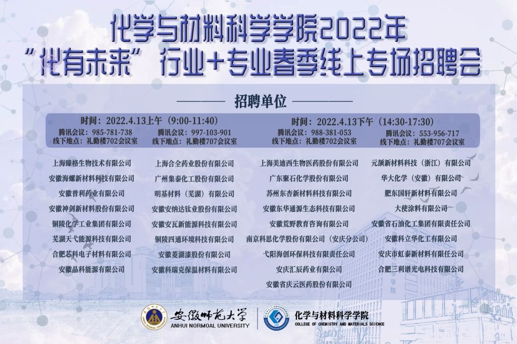 经前期学院联系、用人单位报名,学院重点遴选,本次招聘会共吸引了包括上海臻格生物技术有限公司、安徽海螺新材料科技有限公司、上海合全药业股份有限公司、广东聚石化学股份有限公司等34余家省内外优质企业参会。本次招聘会通过腾讯会议平台进行,采取企业线上宣讲,学生线上+线下参会模式,分两个会场、四个场次进行,提供就业岗位数百个,涵盖化学、化工、材料、生物、计算机、机械、自动化等多个专业。