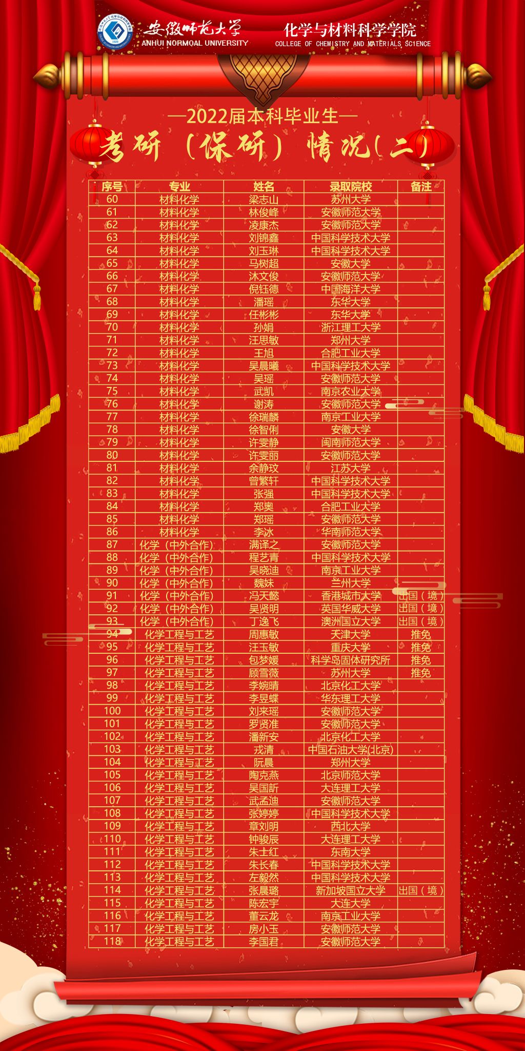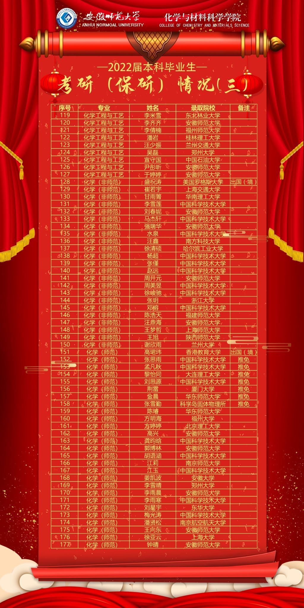 化学(师范)专业(7#225):陈璿考研至华东师范大学,龚昀晗考研至中国科学技术大学,高兴、王怡哲考研至安徽师范大学。