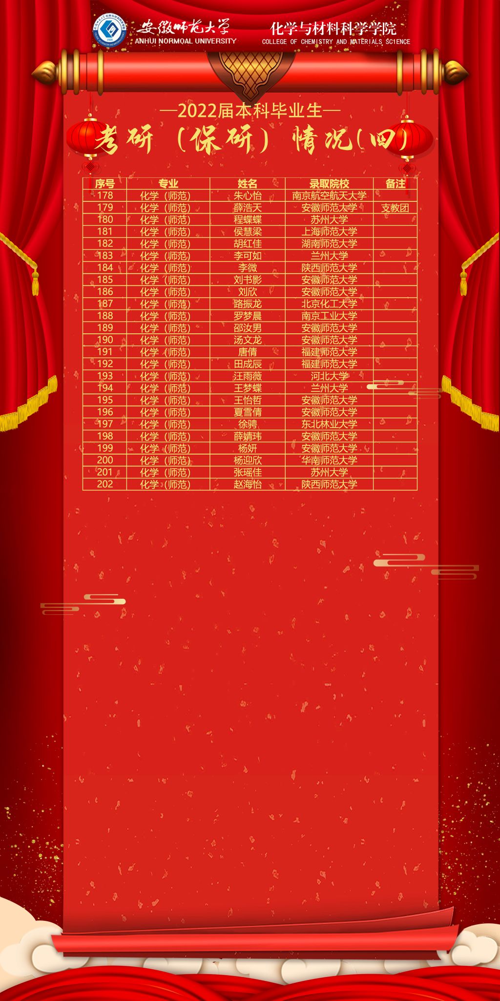化学(师范)专业(7#105):李雪晴考研至郑州大学、李雨晨、刘书影、刘欣考研至安徽师范大学。