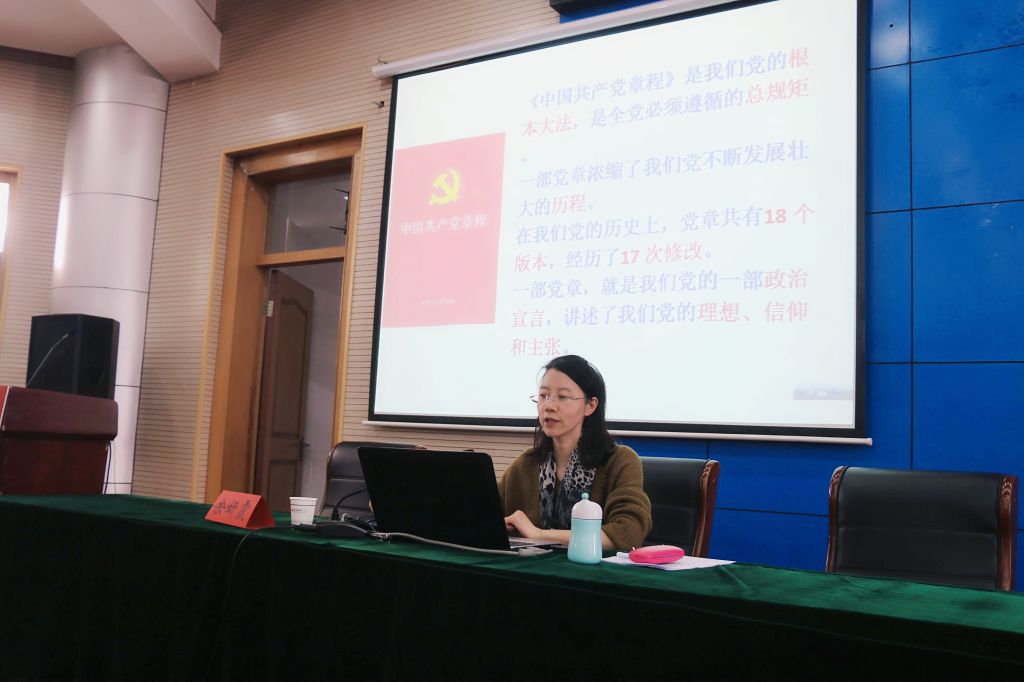 学党章,正动机。校党委组织部副部长余妍霞作《学党章、悟思想、正动机》的专题报告。她通过“讲故事——看视频——记笔记”的方式讲述了六位先进共产党人用生命守卫信仰、用忠诚维护党章尊严,用热血践行使命和初心的感人事迹。随后,余部长详细介绍了党章的历史沿革和主要内容,重点谈及了十九大党章修改的重要内容。她要求同学们,生在祖国发展最好的时代,要深刻领会到党章的深刻内涵,坚守共产党人的初心和使命,按照党员标准严格要求自己。