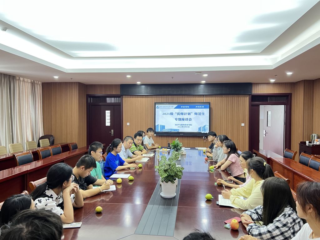 召开了2021级化学“优师计划”师范生专题座谈会,学习习近平总书记给北京师范大学“优师计划”师范生回信精神,交流心得体会,学院副院长方臻、辅导员陶勇和全体“优师计划”学生参加了座谈会,会议由院党委副书记李古州主持。