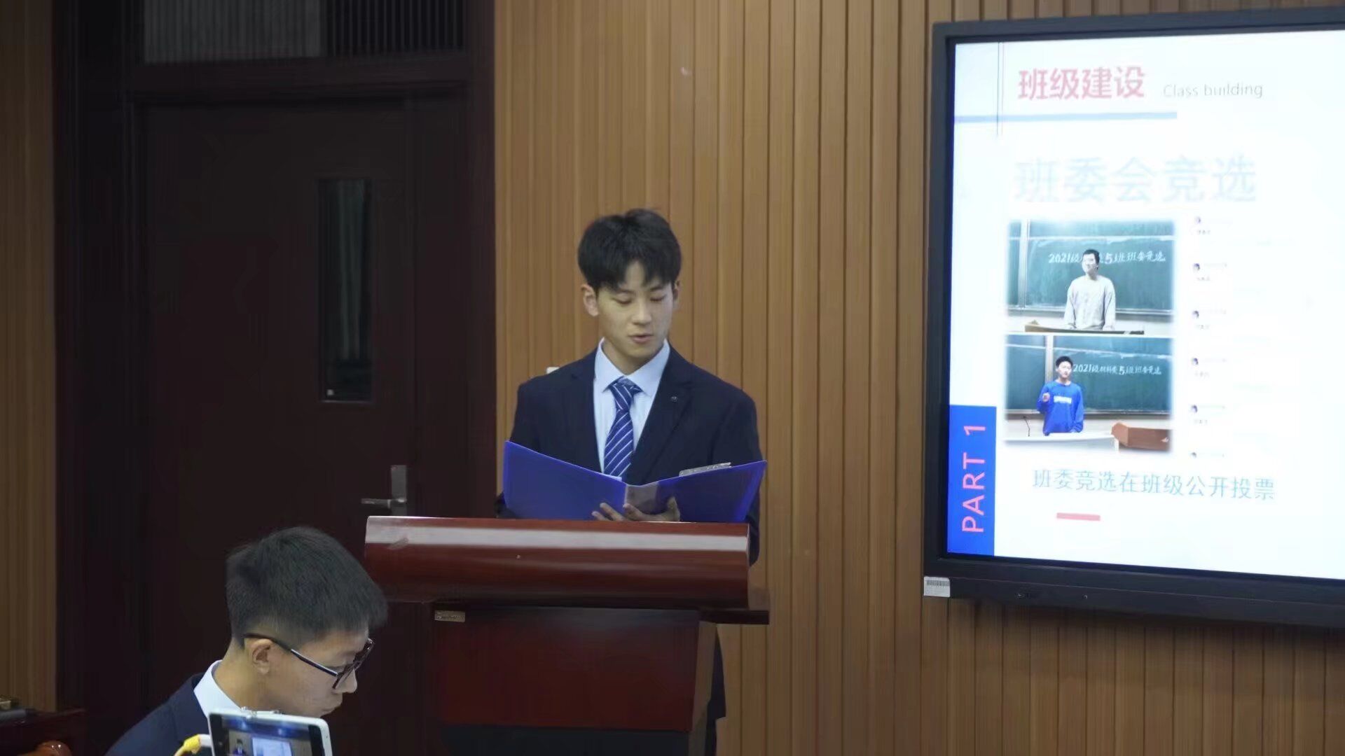 汇报中,各参评班级汇报人根据抽签顺序,结合视频、ppt等形式详细介绍了班级在组织建设、思想引领、学风建设、基础文明等方面的优秀做法与典型成效,个人的演讲与台上的演示充分融合,从不同视角对集体所做的所有工作进行全面总结,全方面展示了班级的基本情况。