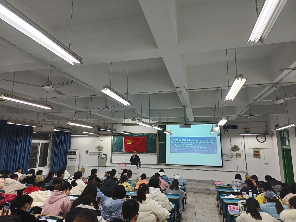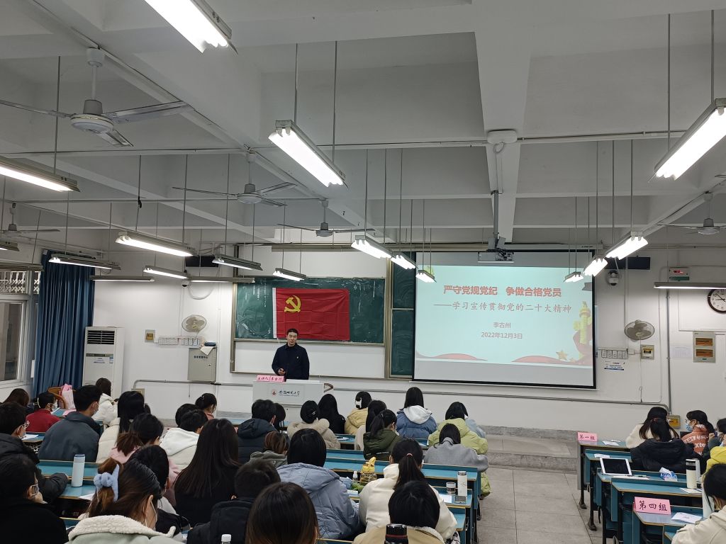 学院党委副书记、纪委书记李古州以《学习党内法规,严守党规党纪——学习宣传贯彻党的二十大精神》为主题,全面梳理了党内法规建设的历程脉络,重点介绍了党的十八大以来党内法规的框架体系和制度体系,详细解读了党的二十大报告中关于“坚定不移全面从严治党,深入推进新时代党的建设新的伟大工程”的内容,深入剖析了《中国共产党廉洁自律准则》《中国共产党纪律处分条例》《关于新形势下党内政治生活的若干准则》这三部重要法规,讲解了党内政治生活的突出问题,同时从增强政治意识、严格工作秩序、自觉接受监督三个方面呼吁全体学生党员要牢记初心使命,严守纪律规矩。