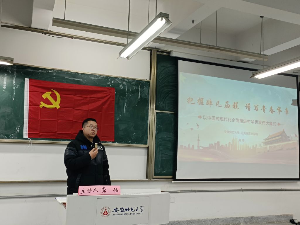 学校学习贯彻党的二十大精神理论宣讲团成员、马克思主义学院副教授龚伟以《把握非凡历程,谱写青春华章》为题,以视频和文字结合的形式从党的二十大会期、议程安排、代表构成与分布、具体学习要求等方面进行了全面介绍。同时,他从“紧扣时代之脉,精准锚定新使命”出发剖析了“两个大局”的具体含义,强调要领会“四个重大意义”,把握温度、力度和高度;从“筑学习之基,深刻领会新思想”出发解析了党的二十大的主要内容和精神内涵;从“绽放青春之花,砥砺奋进新征程”出发向学生党员提出要有理想主义追求、要有担当作为闯劲、要有吃苦耐劳精神,要有团结奋斗品质,在攻坚克难中创造业绩,用青春和汗水创造出新征程上的新奇迹。