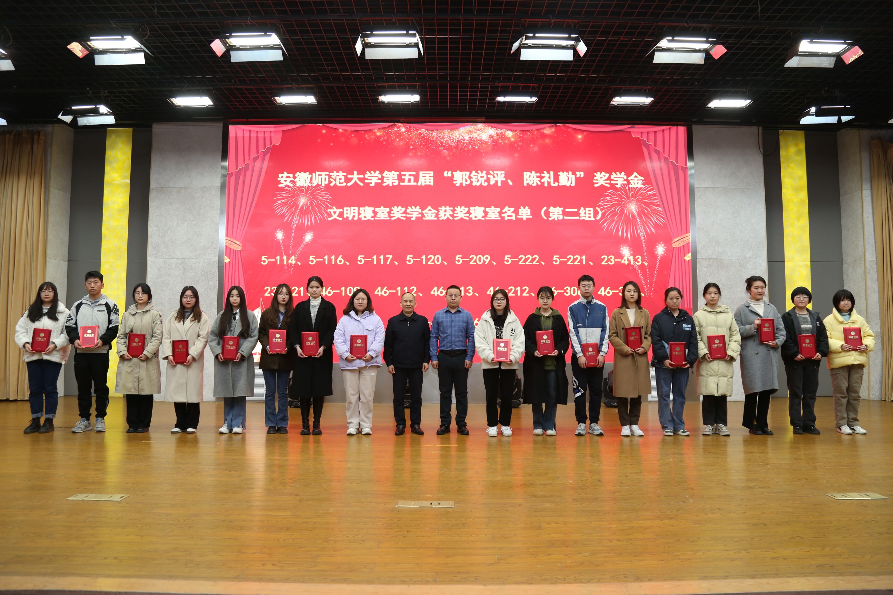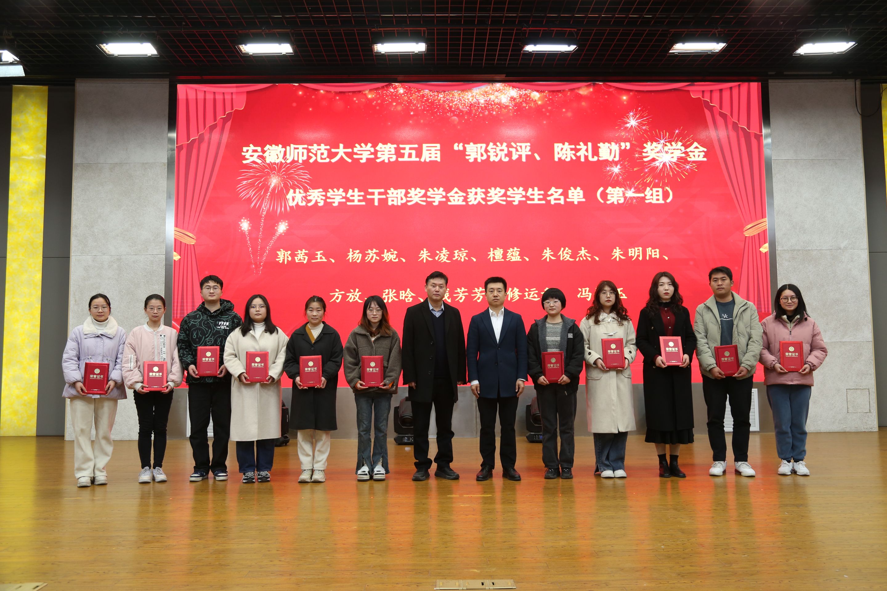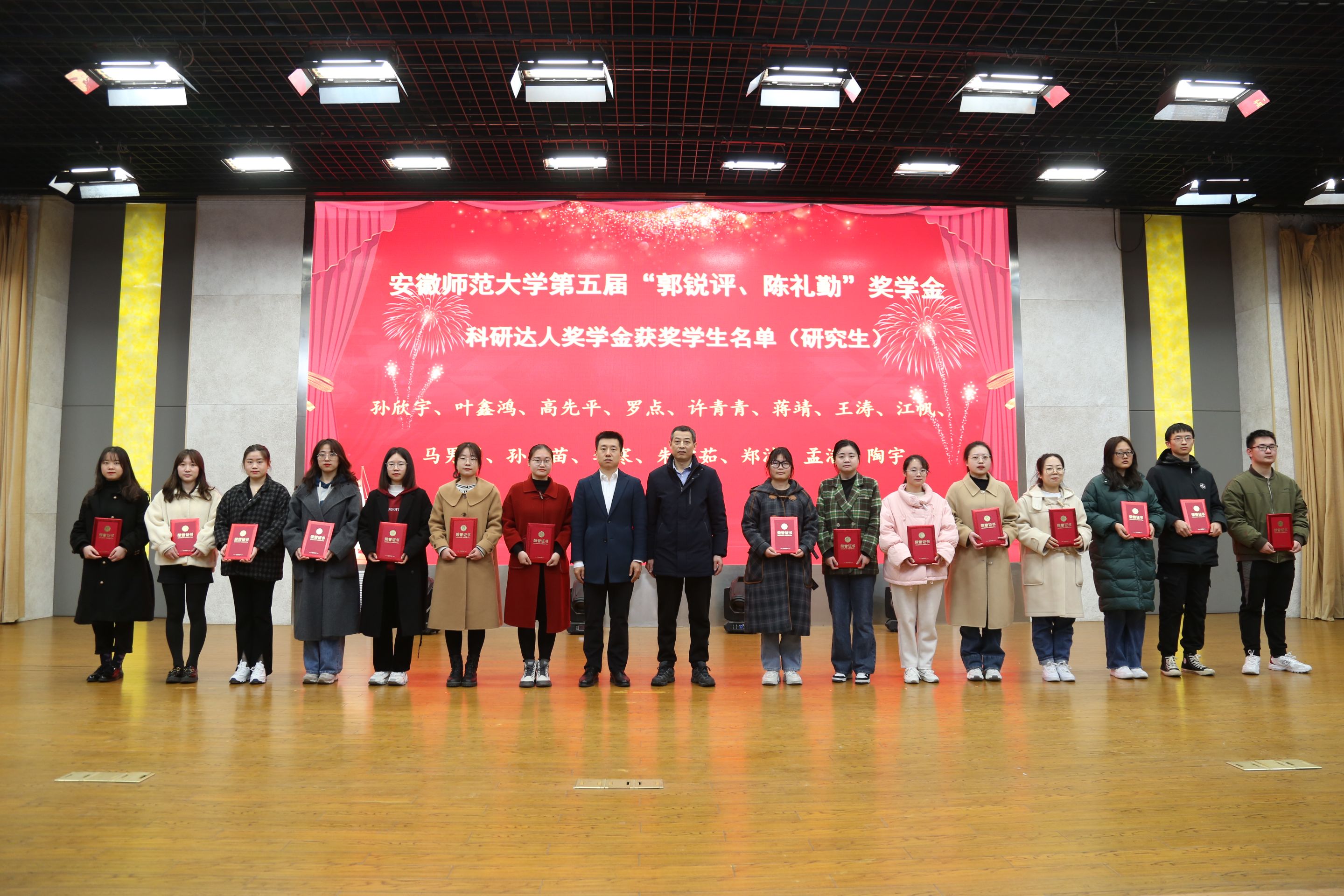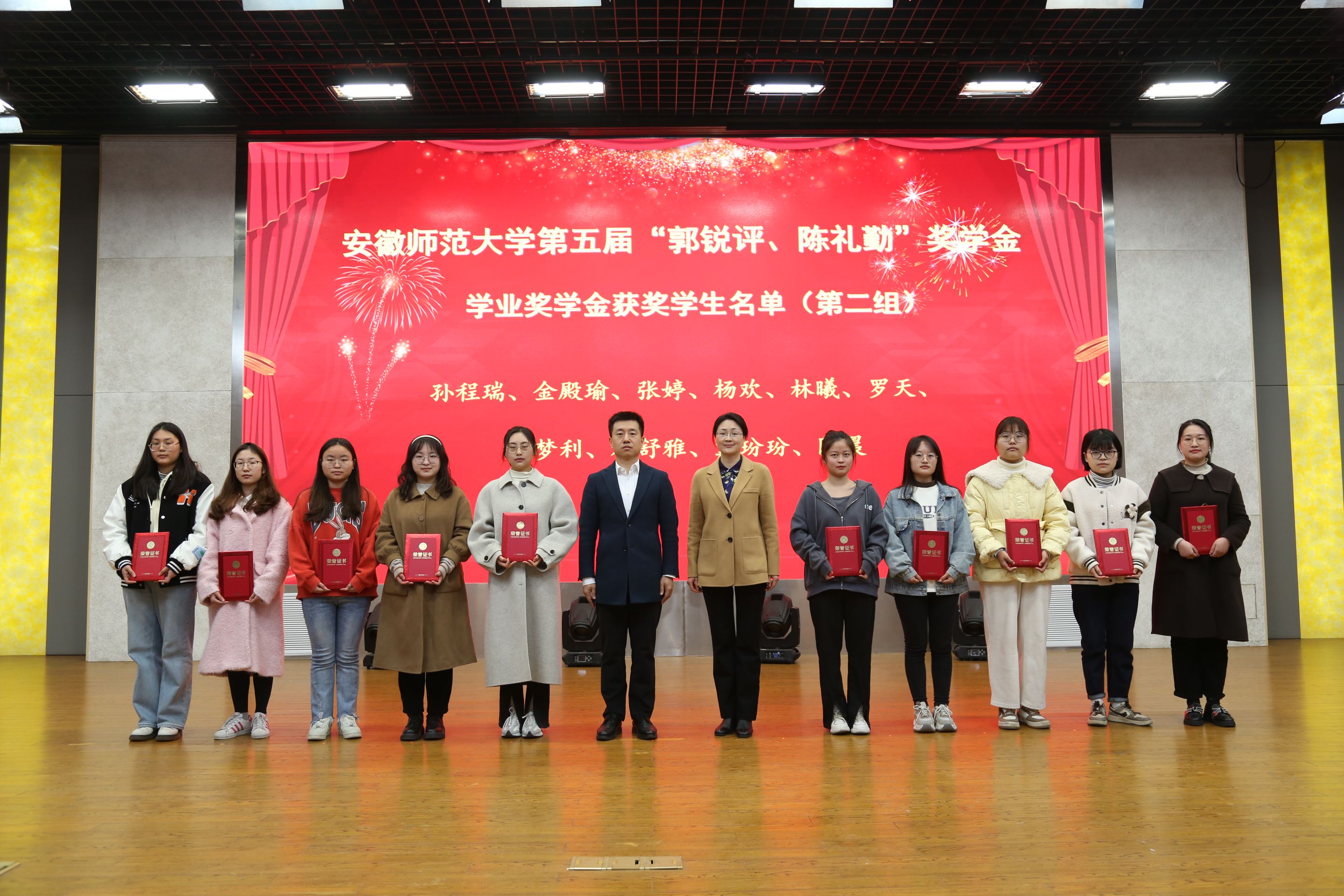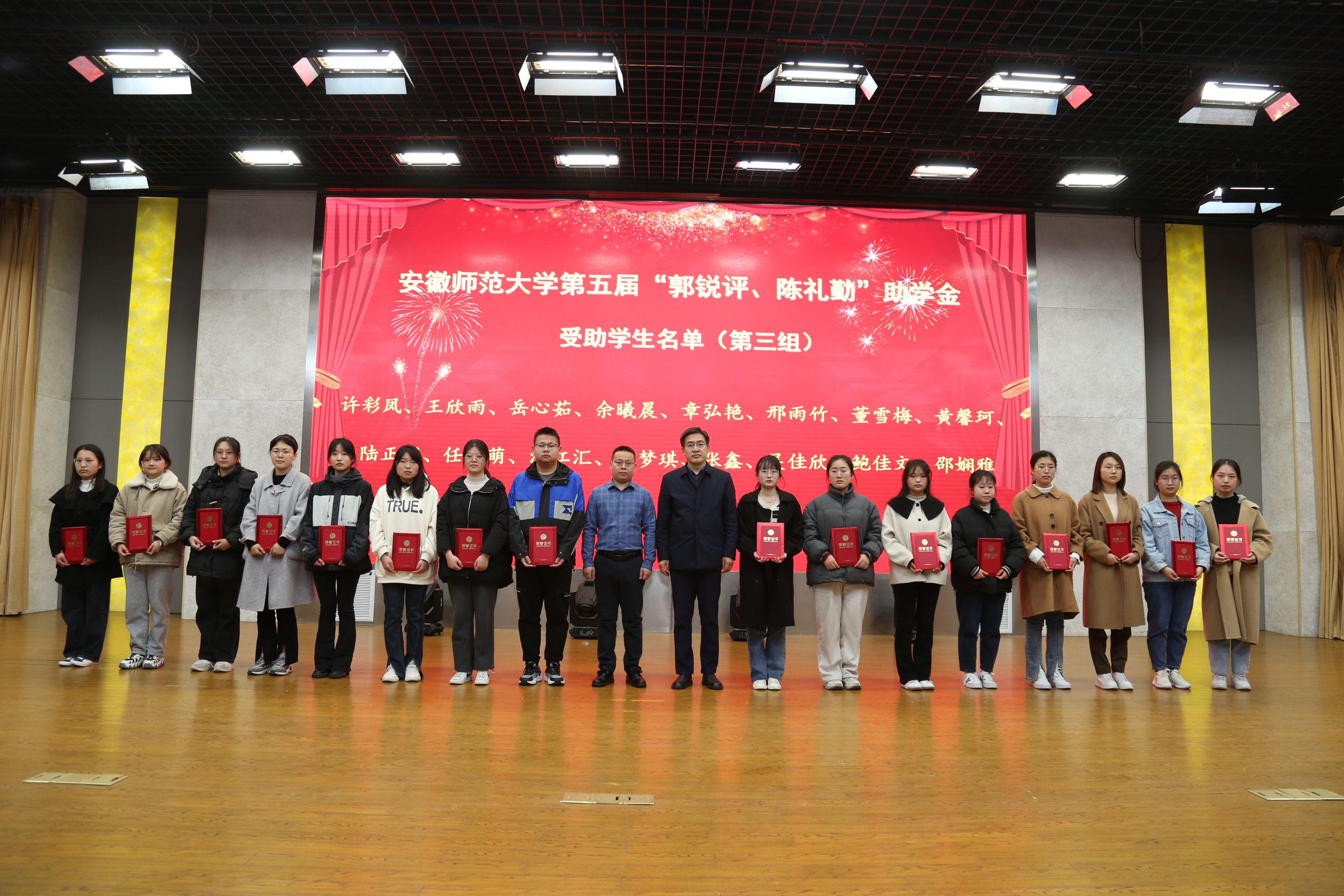 活动在庄严的国歌中拉开序幕。项目负责人贡植斌老师代表基金会首先宣读了《关于颁发安徽师范大学第五届“郭锐评、陈礼勤”奖助学金的决定》,与会嘉宾们分5个批次共15组向209名获奖、受助学生颁发奖助学金获奖证书。