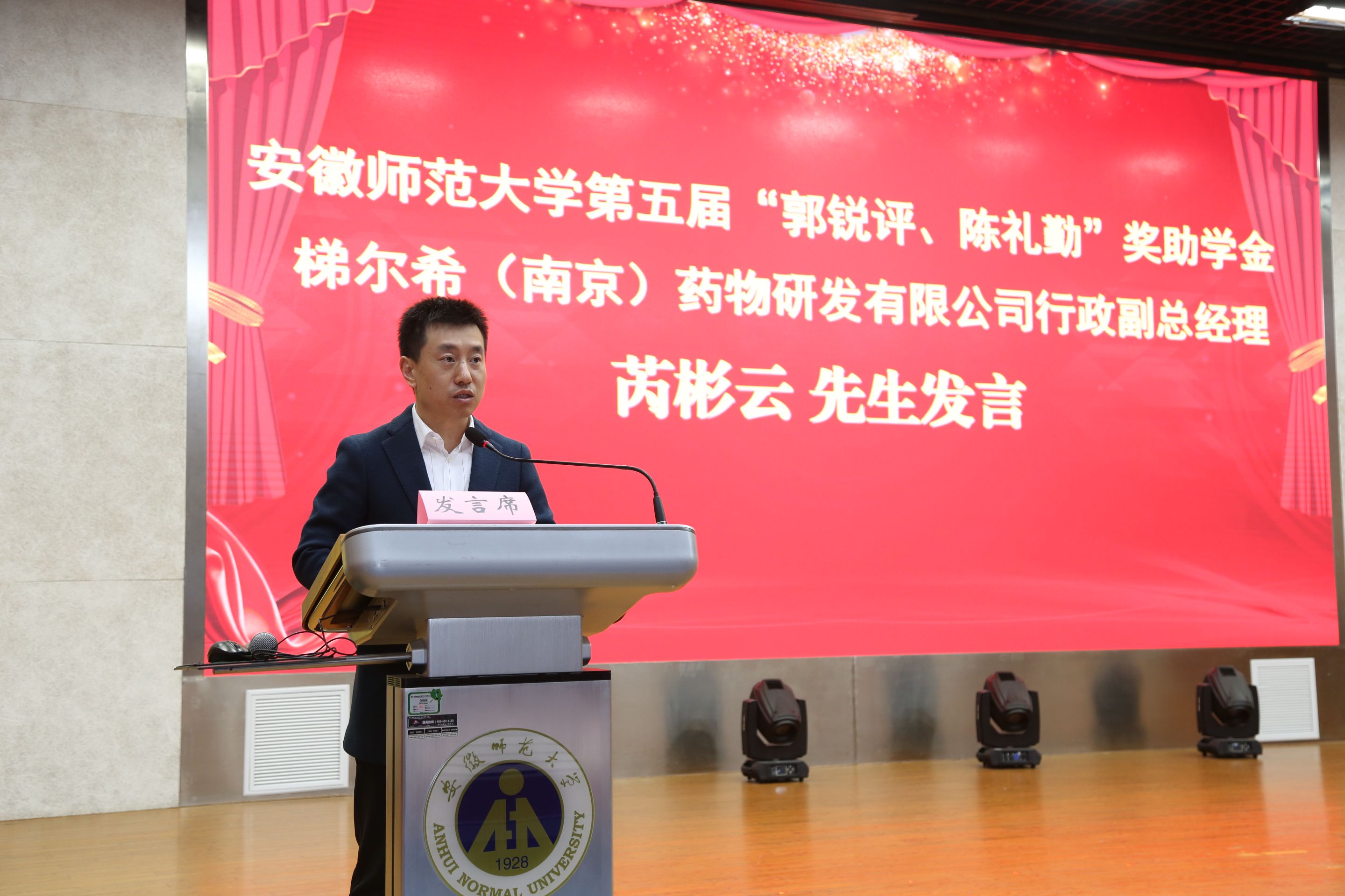 王如意老师代表学校教育基金会向梯尔希(南京)药物研发有限公司芮彬云先生一行表示热烈欢迎,向获奖、受助的同学表示热烈的祝贺。他指出,“校友是母校靓丽的名片”,母校的建设与发展得到了校友们的广泛关注,得益于校友们的大力支持。他寄语广大青年学生:要不负青春,做一位有志气的新时代青年,志存高远、胸怀天下,厚植家国情怀,树立为祖国和人民永久奋斗、赤诚奉献的远大理想,立志做有理想、敢担当、能吃苦、肯奋斗的新时代好青年。要不负韶华,做一位有骨气的新时代青年,始终保持热爱学习、勤于奋斗的本色,主动适应学校培养一流人才的目标和要求,积极为学校“两大振兴行动计划”增添力量。要不负时代,做一位有底气的新时代青年,对未来早作规划、设立目标,重视课内外实践训练,关注学科前沿和未来发展,做到融会贯通、厚积薄发,让青春在党和人民需要的地方绽放绚丽之花。