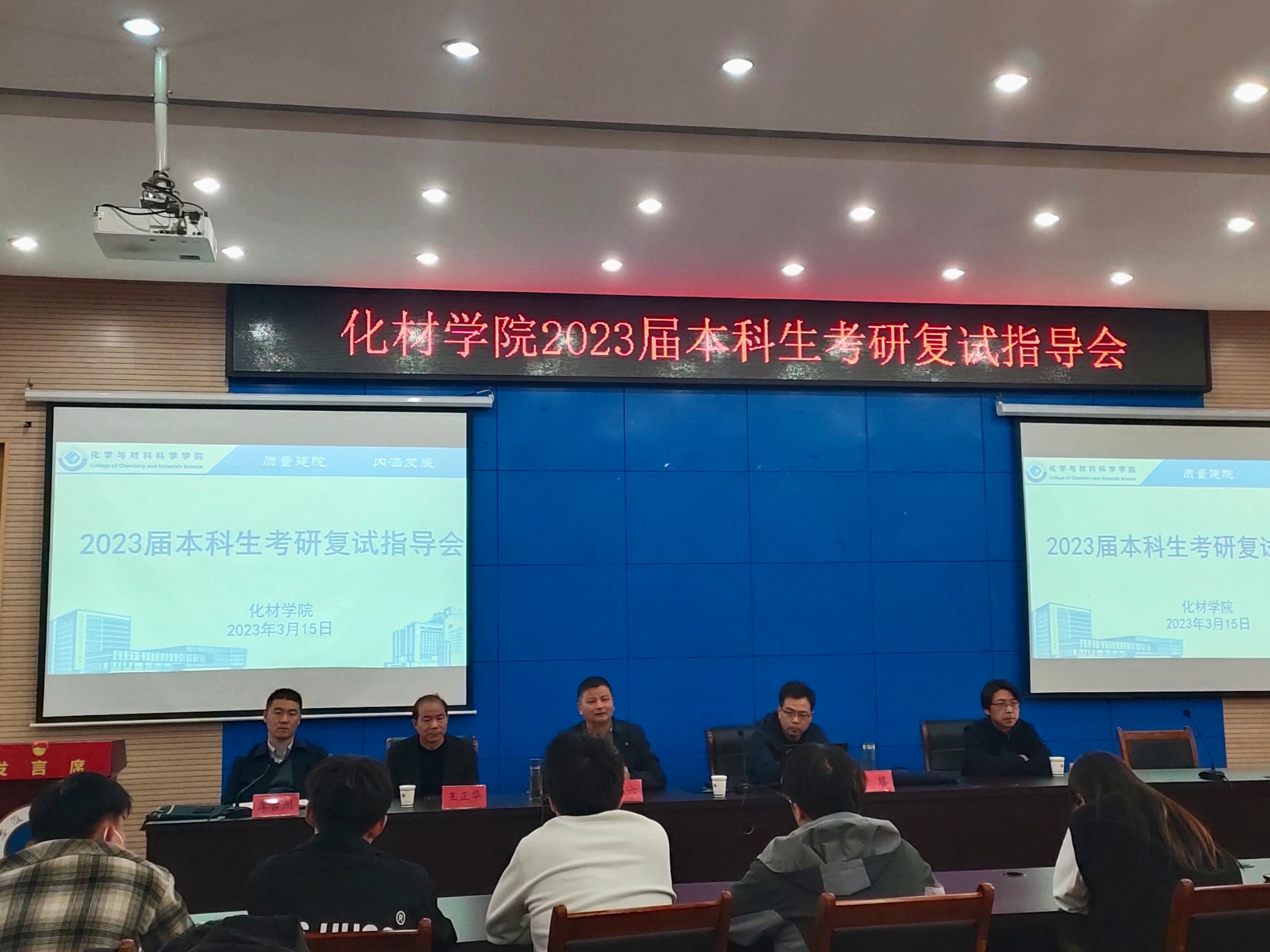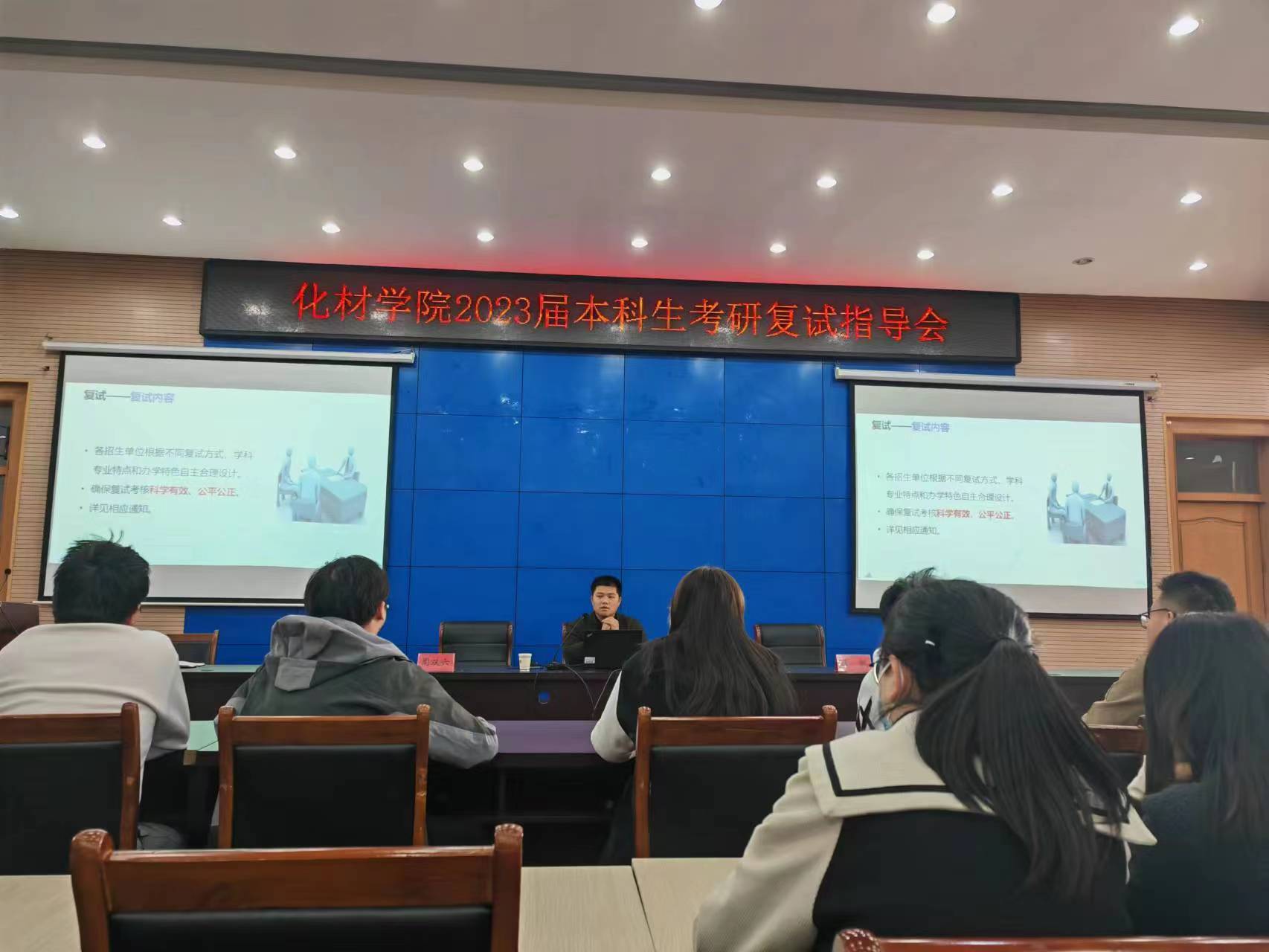 研究生院研招办张崇老师就考研复试、调剂的相关政策进行了详细的解读。方臻、周双六介绍了学院考研总体情况、分析了2023年我校相关专业报考和录取情况,建议考生通过查阅资料、咨询老师或者往届学生等方式充分了解学校、专业和接受调剂等情况,并勉励学生调整好心态、好好准备复试。王正华、崔鹏老师着重从面试技巧、专业理论知识准备、专业英语备考、导师联系等方面向学生提供了具体指导。指导老师们表示,考研复试是对学生的综合素质的考察,也是同学们展现自我的机会,无论是专业知识、科研素养还是精神面貌等都是老师看中和关注的焦点,希望同学们一定要做好充分的准备,充分展示化材学子的自信和能力。