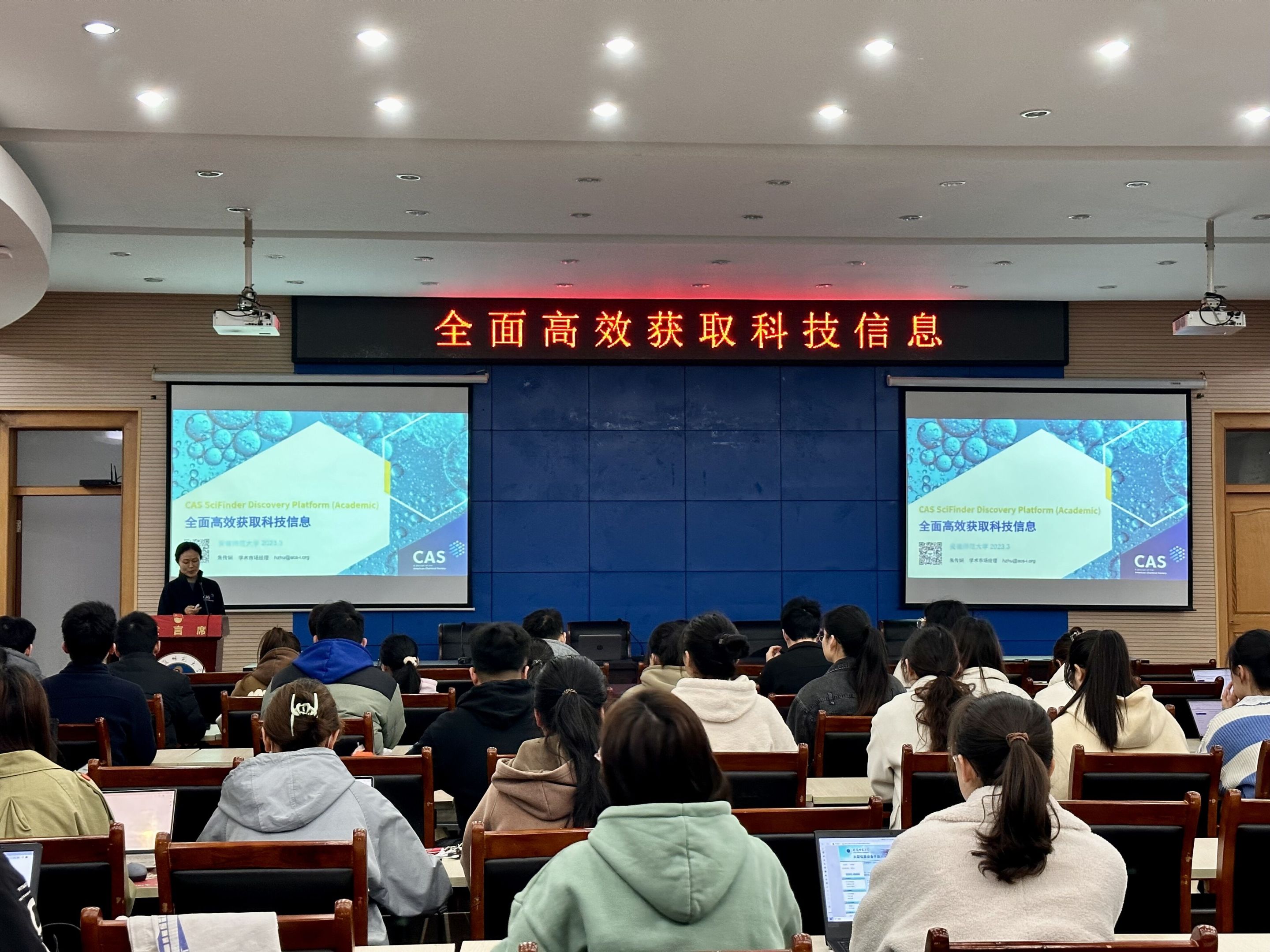 于花津校区会议中心第三报告厅举办题为“全面高效获取科技信息”的文献检索培训会。培训会特邀美国化学文摘社(CAS)学术市场经理朱传娴主讲,学院部分教师及2022级全体研究生参加了此次培训。