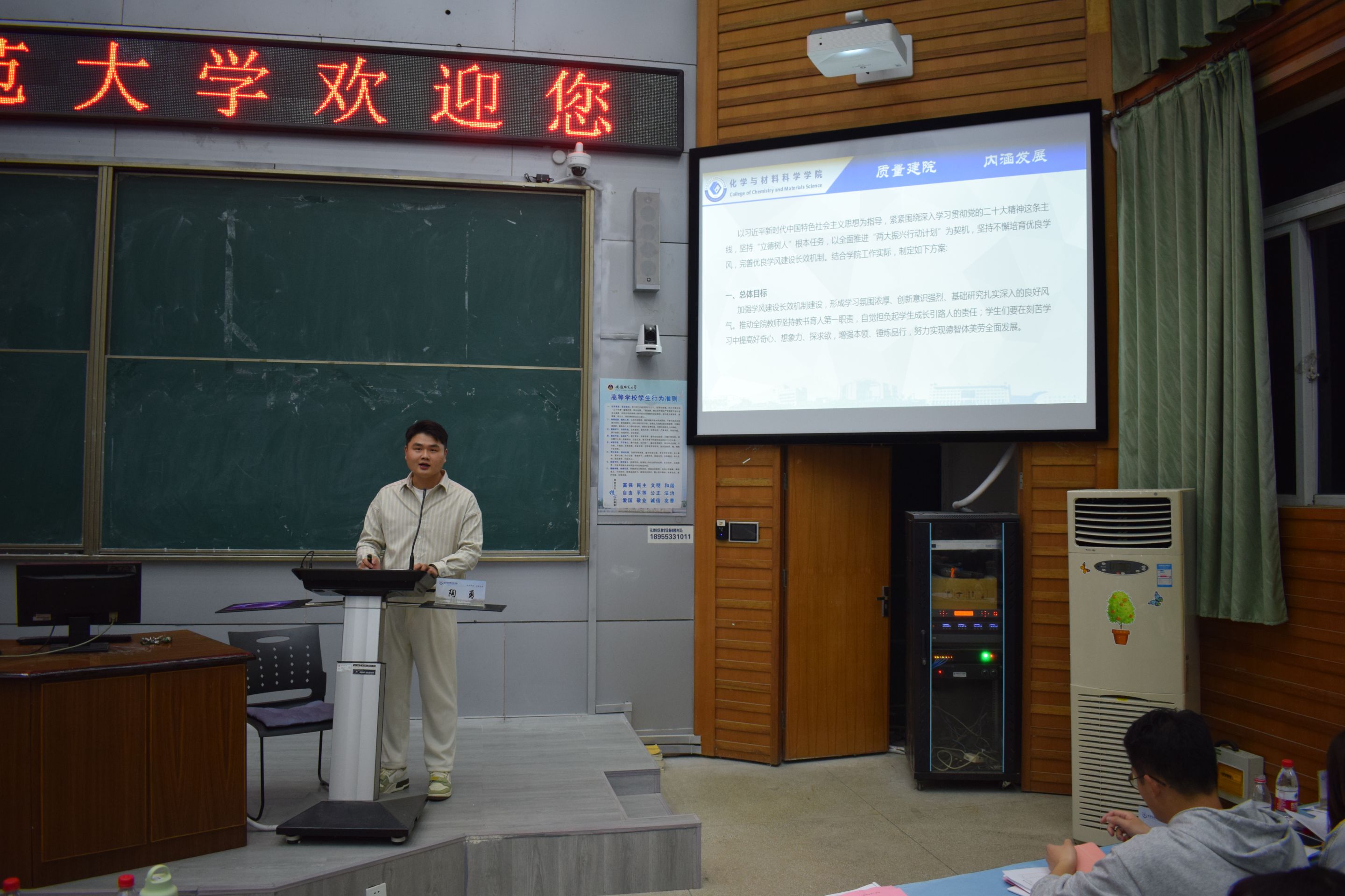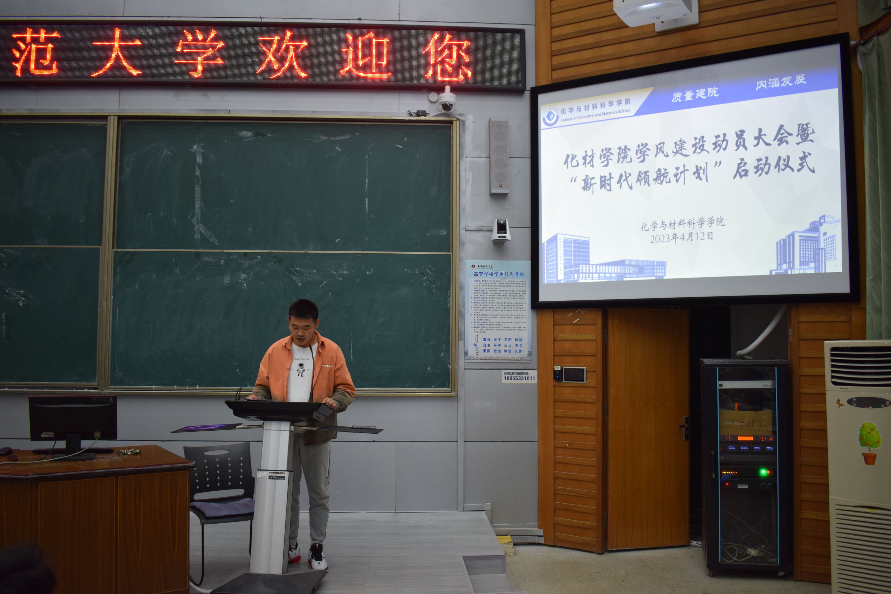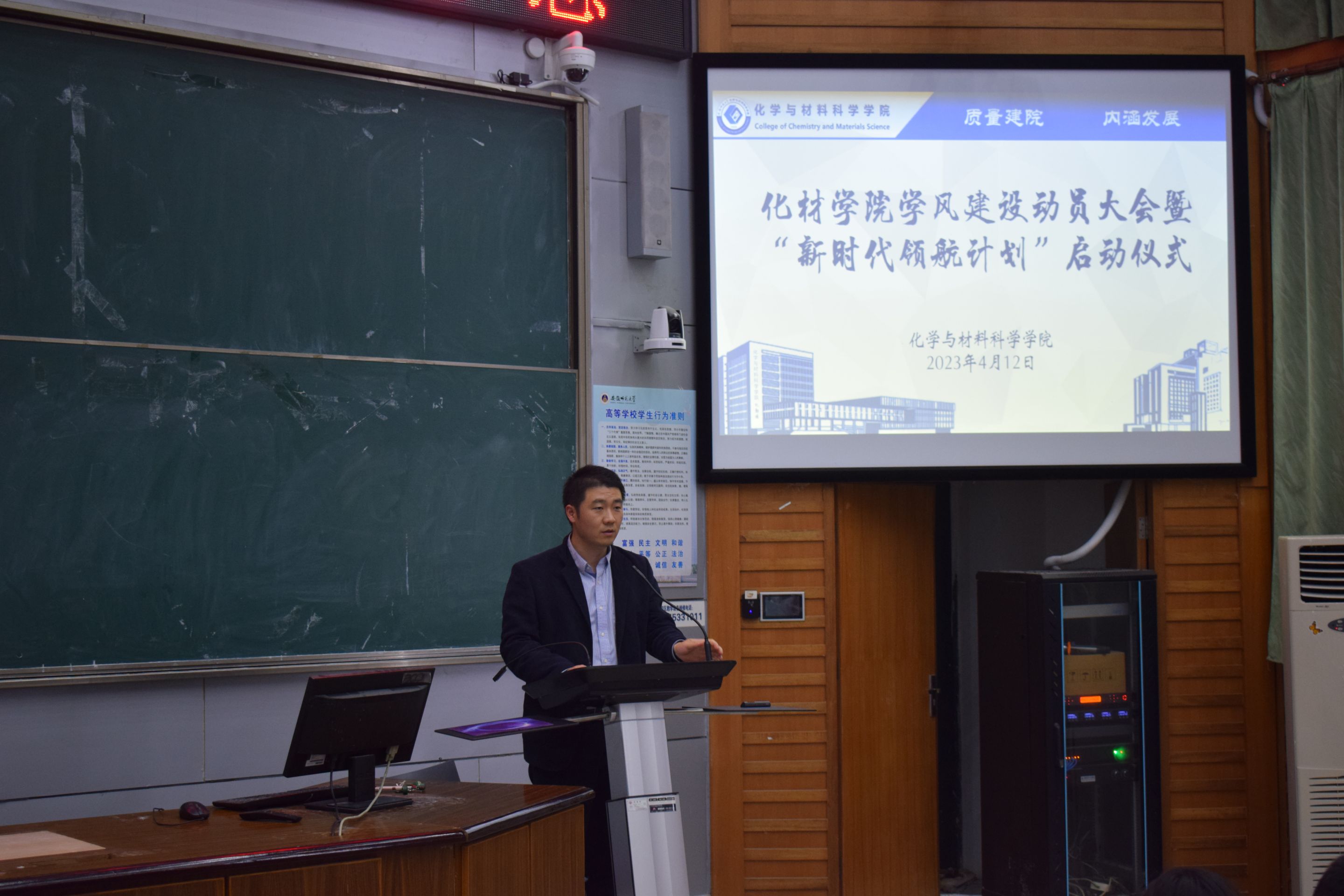 学院团委副书记、辅导员陶勇通过PPT对学院学风建设工作方案和“新时代领航计划”进行了解读,他从总体目标、广泛宣传营造优良学风、以良好的环境推动学风、以严格的管理保障学风、以丰富的活动引领学风等方面介绍了学风建设工作方案的具体举措,从思政领航、管理护航、专业导航、文化引航、服务助航等方面介绍了年度学生工作计划。2020级材料化学专业陈功洋代表学院全体学生宣读了倡议书,倡导每一位化材学子积极响应、积极配合,扎实推进学院学风建设工作,坚持从小事做起,从自身做起,从现在做起,营造优良学风。