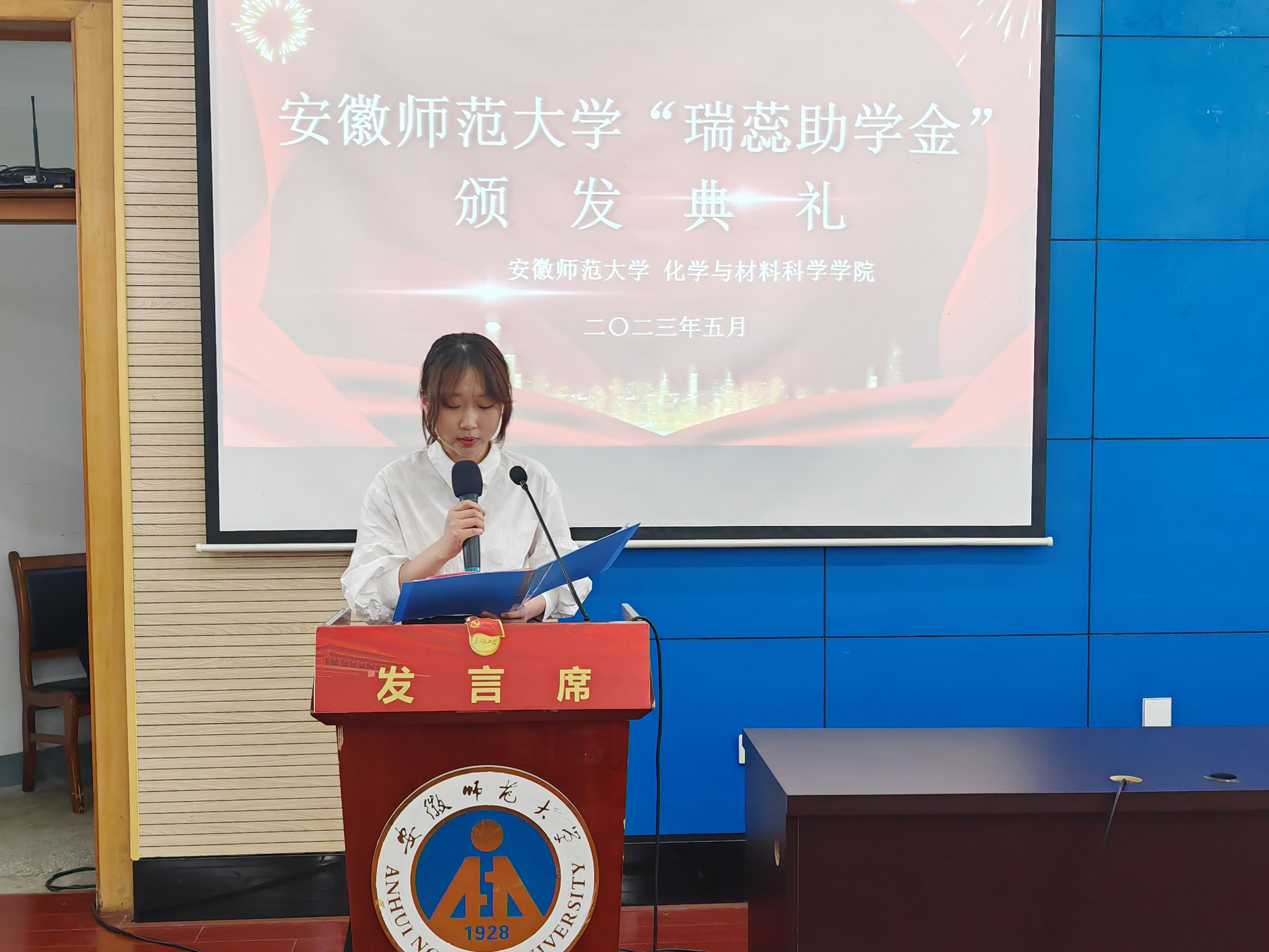 受助学生代表王亚辉和崔玲惠同学代表第一届、第二届受助学生表达了对胡浩捐资设立“瑞蕊助学金”的感激之情,她们表示助学金的设立和发放让经济困难的学子安心在校园内学习,让贫困学子感受到了学校的温暖以及校友对母校教育事业发展的关心,两位同学表示将珍惜机遇、自立自强、奋发进取,立志于回馈社会。