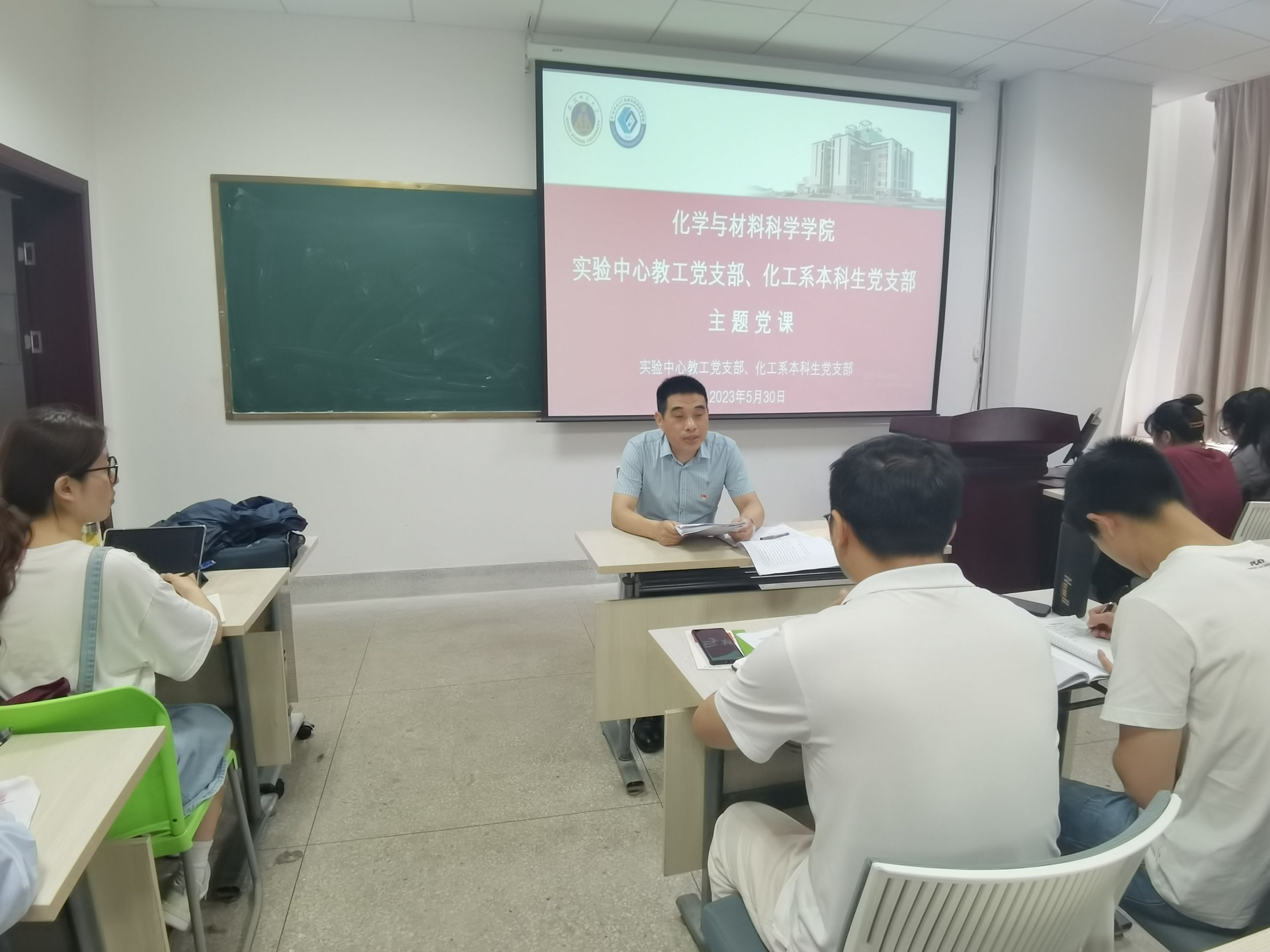 党委委员、副院长王波涛在礼勤楼838会议室为实验中心教工党支部和化工系本科生党支部讲授题为“学习贯彻习近平新时代中国特色社会主义思想暨实验室安全管理工作主题教育”的专题党课,会议由化工系本科生党支部书记张浩主持。