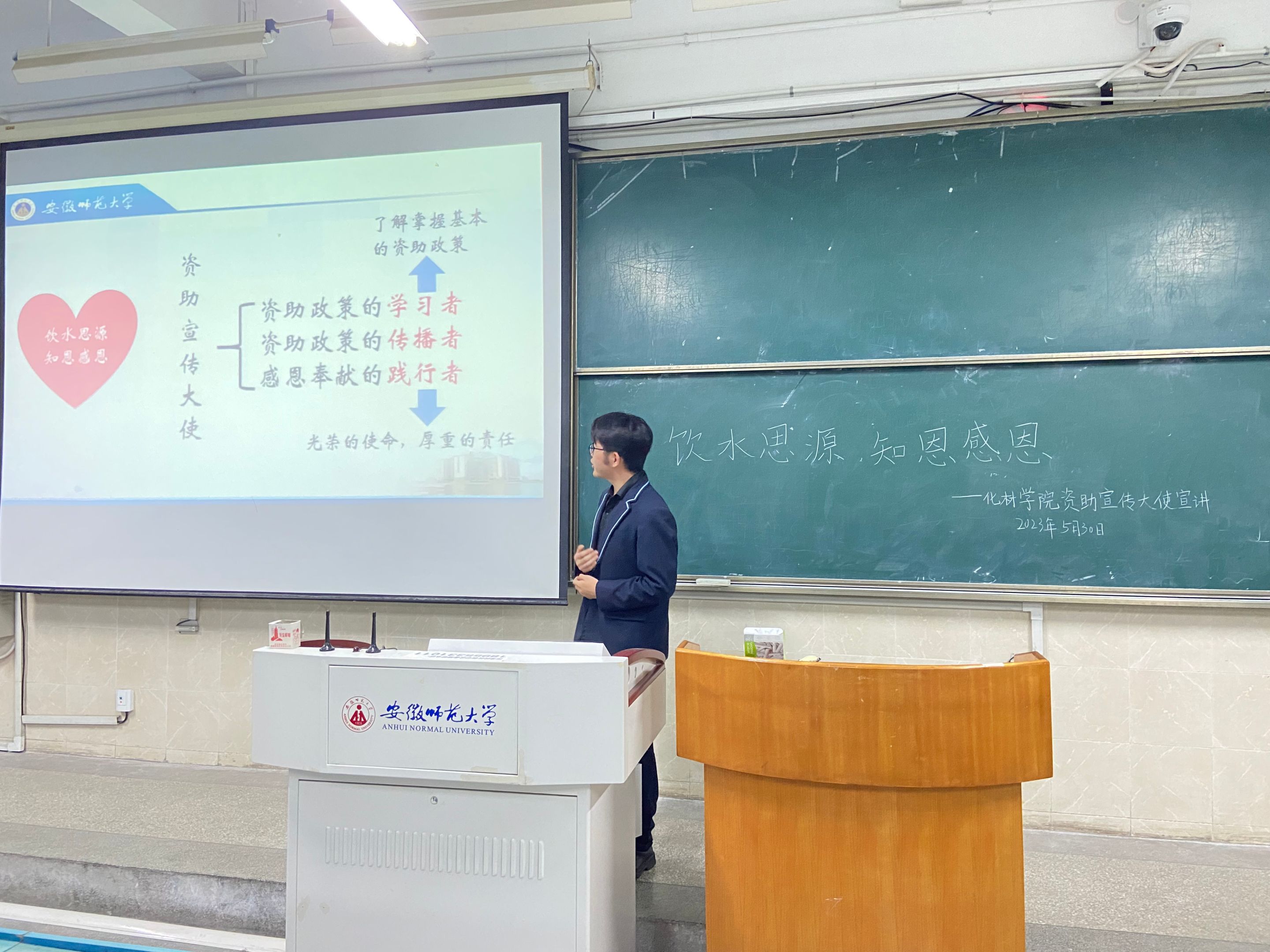 资助宣传大使陈子祥、苗丹同学在班级开展了“饮水思源,知恩感恩”资助宣传。陈子祥提到自己进入大学两年以来的经历和收获,之后着重介绍了关于国家资助政策和学校的资助政策、申请流程和条件等。解答了同学们对助学贷款中的疑问,然后向班级同学宣传勤工助学工作,号召有诚信懂感恩的同学们加入。最后呼吁受奖助同学要以感恩之心,行诚信之实,报资助之恩!星星资助也能温暖人心,卓卓梦想才能扬帆起航!通过班级宣传,同学们对于生源地助学贷款、国家奖助学金、社会资助和校本奖学金的奖助政策都有了更为深入的了解。
