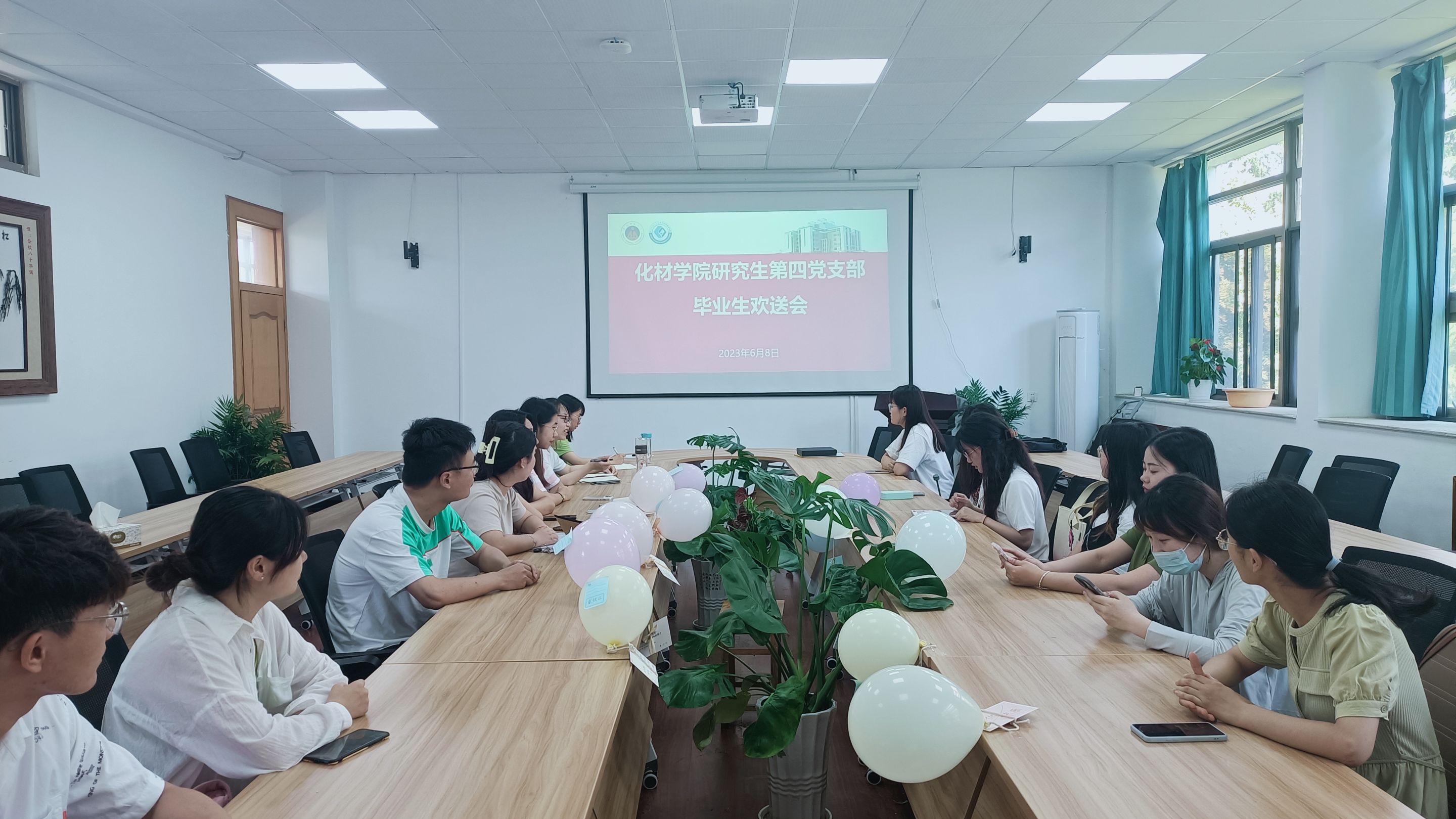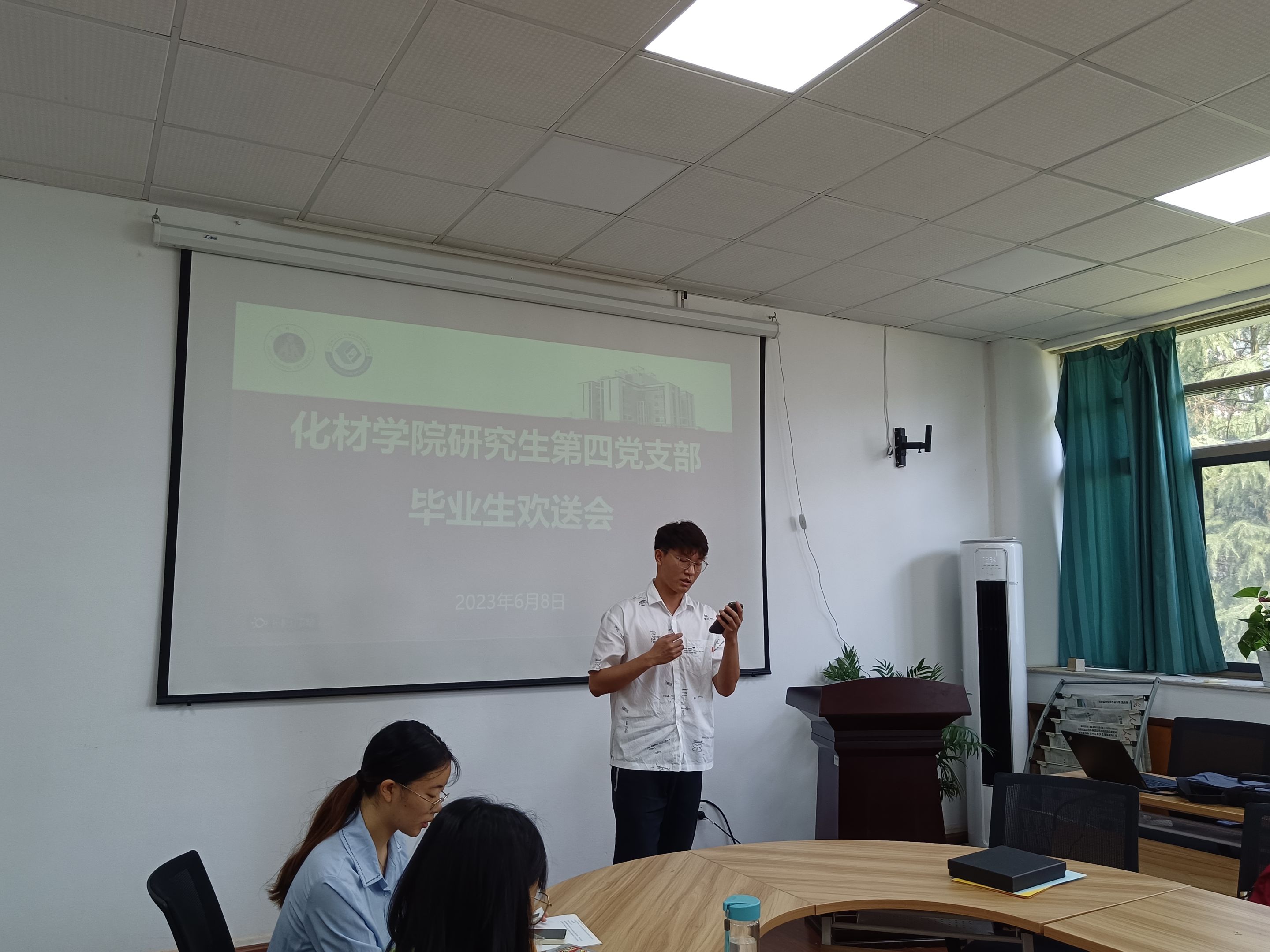 研究生第四党支部于学苑北楼9号楼205会议室举办2023届毕业生党员欢送会,研究生辅导员张薇、邱霞,毕业生党员以及2022级党员代表、入党积极分子代表参加本次活动,活动由研究生第四党支部支委胡宇阳主持。