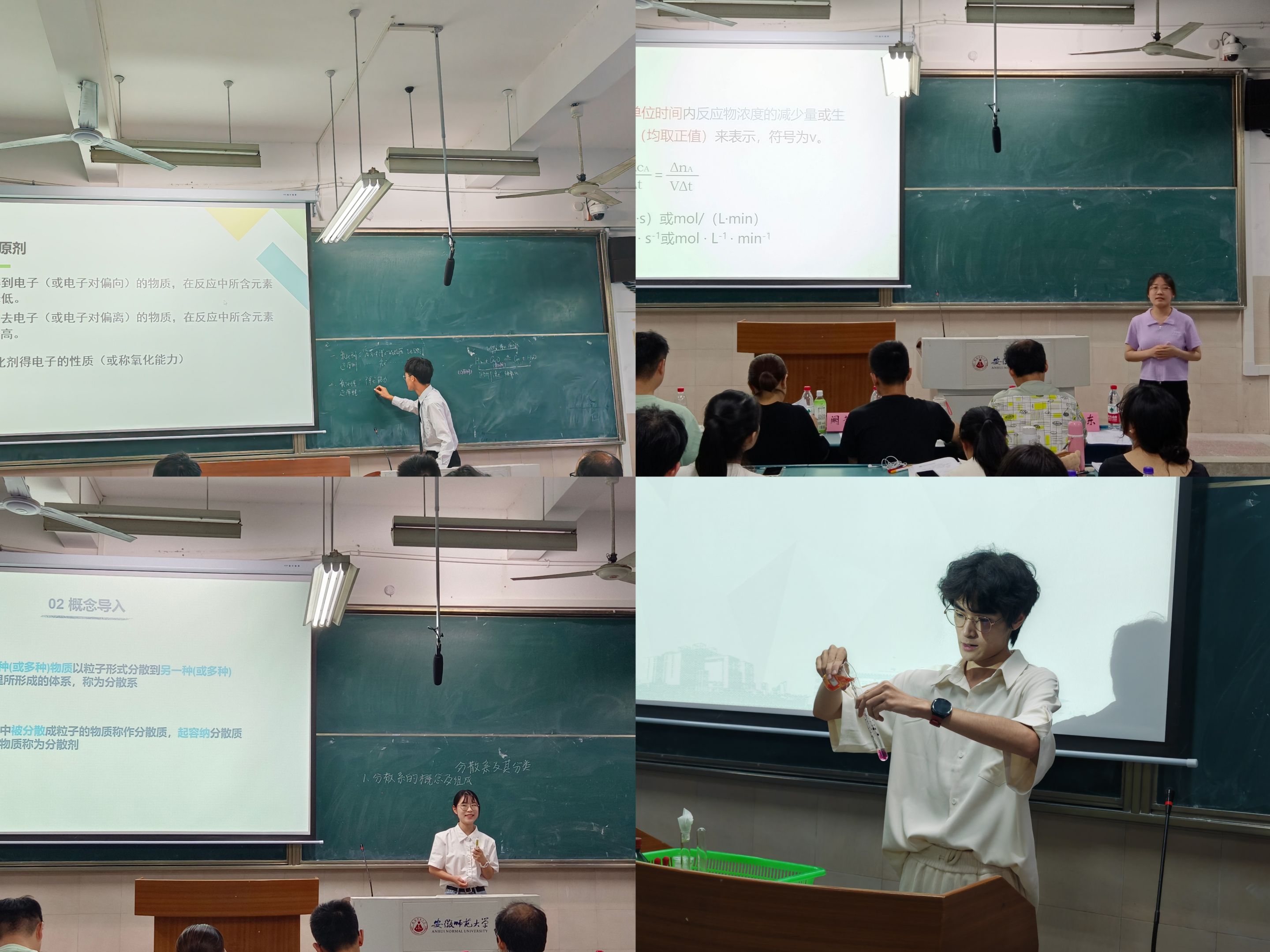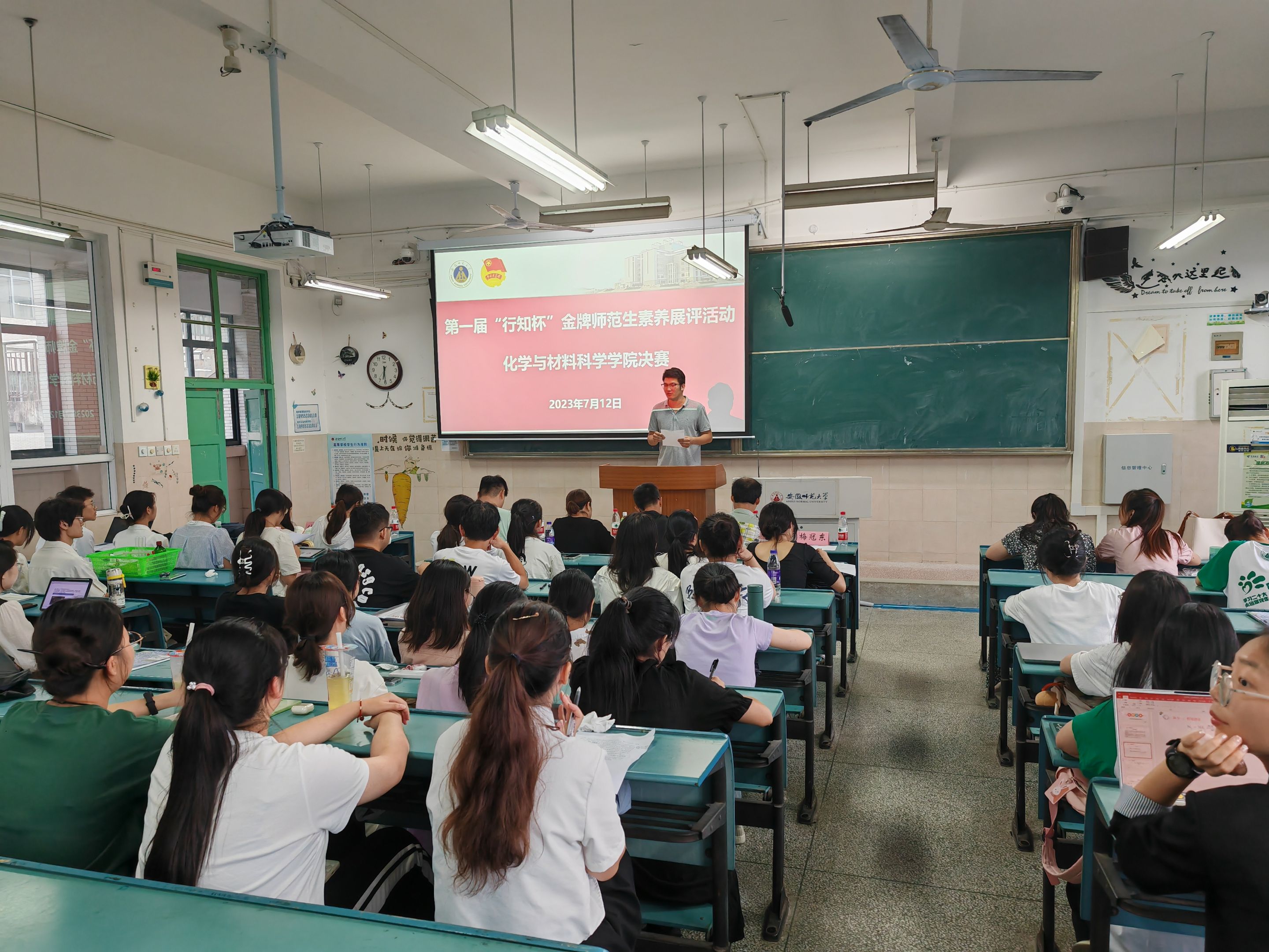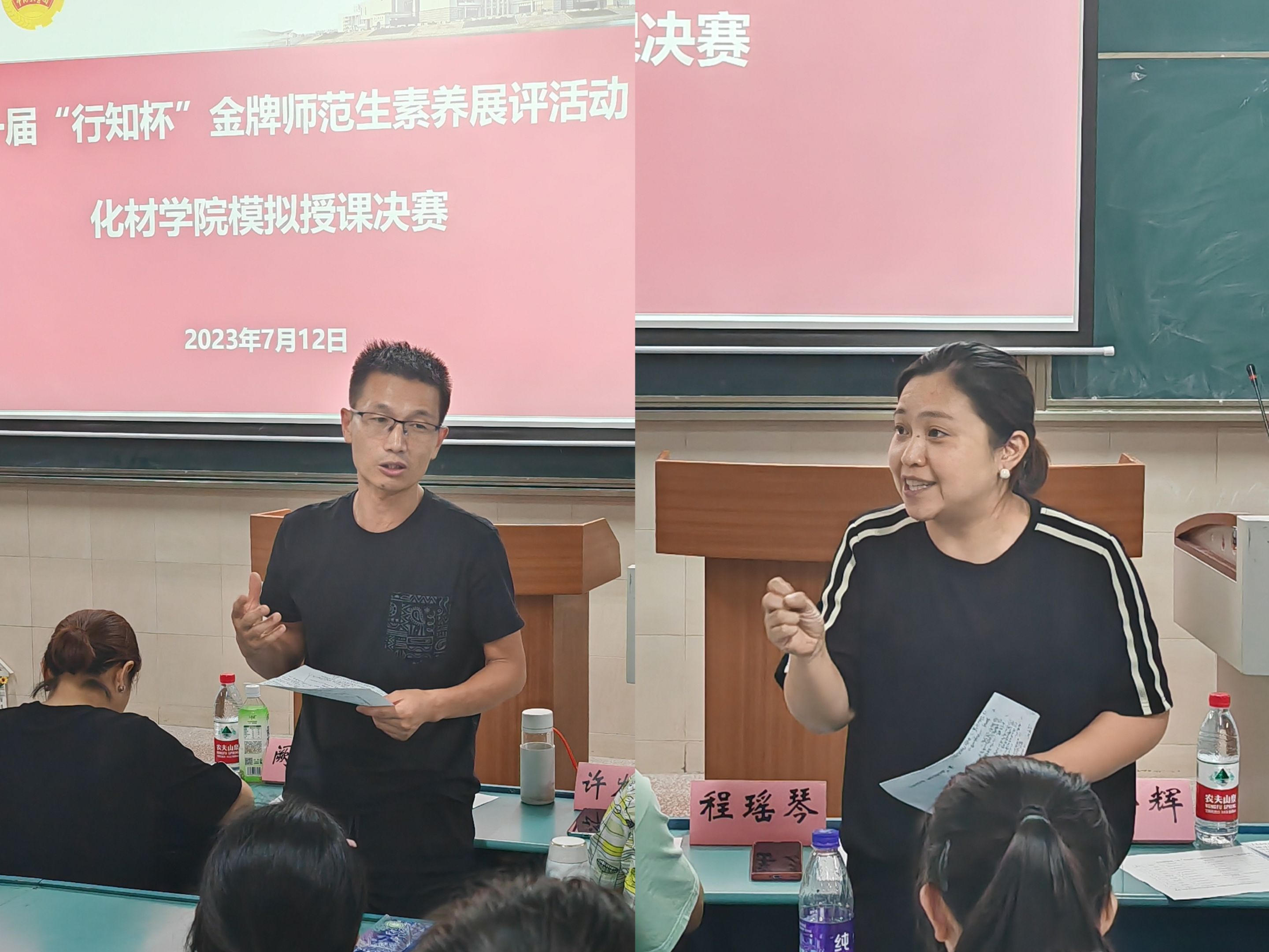 在教学楼5号楼301、302教室举行首届“行知杯”金牌师范生素养展评活动决赛。化学系阙荣辉、程瑶琴老师,化工系许发功老师,辅导员陶勇、陈静、王芳、王霞、付娜出席活动并担任评委。活动由学院团委书记梅冠东主持。