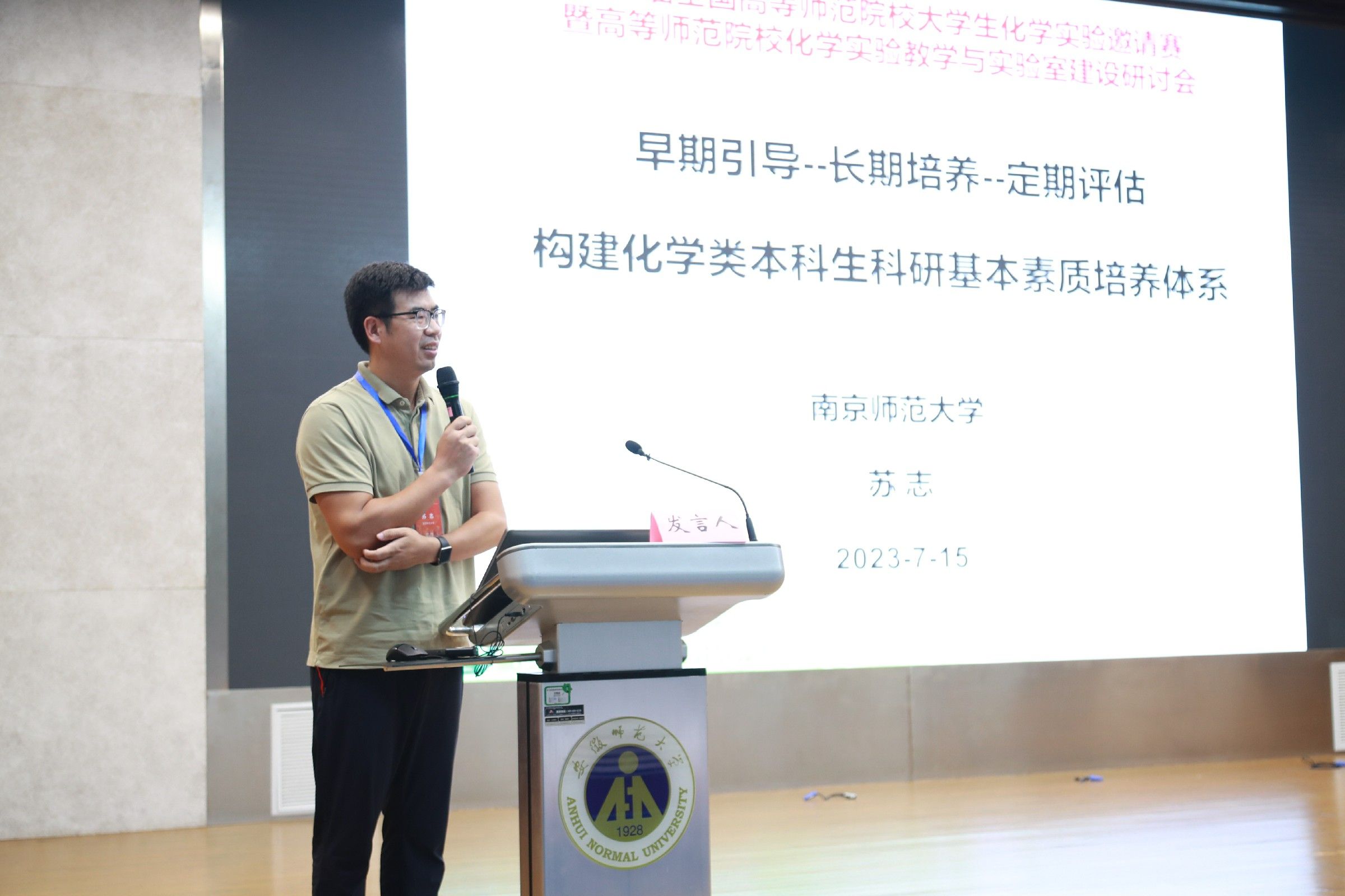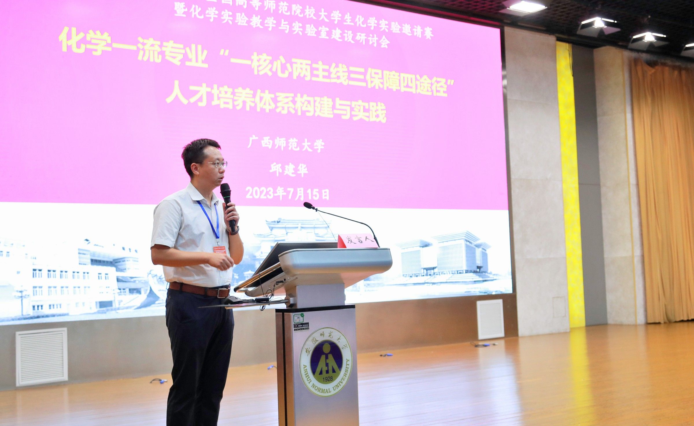 的基本情况。他指出,实验室是高校科技创新的摇篮,实验教学与实验室建设是培养学生创新能力的重要环节,对于提升学生实践能力、创新精神和团队协作能力具有重要作用。此次比赛和研讨会作为检验化学实验教学改革的成果和大学生创新实践活动的重要平台,在全国已经连续举办七届,对于提高学生的实践能力和科学素质,提升化学实验教学与实验室建设水平,培养和选拔更多的优秀科技创新人才都具有重要意义。希望参会指导教师们能在实验教学研讨会中展开深入讨论,通过相互交流、学习和借鉴使大学实验教学水平再上一个新台阶。