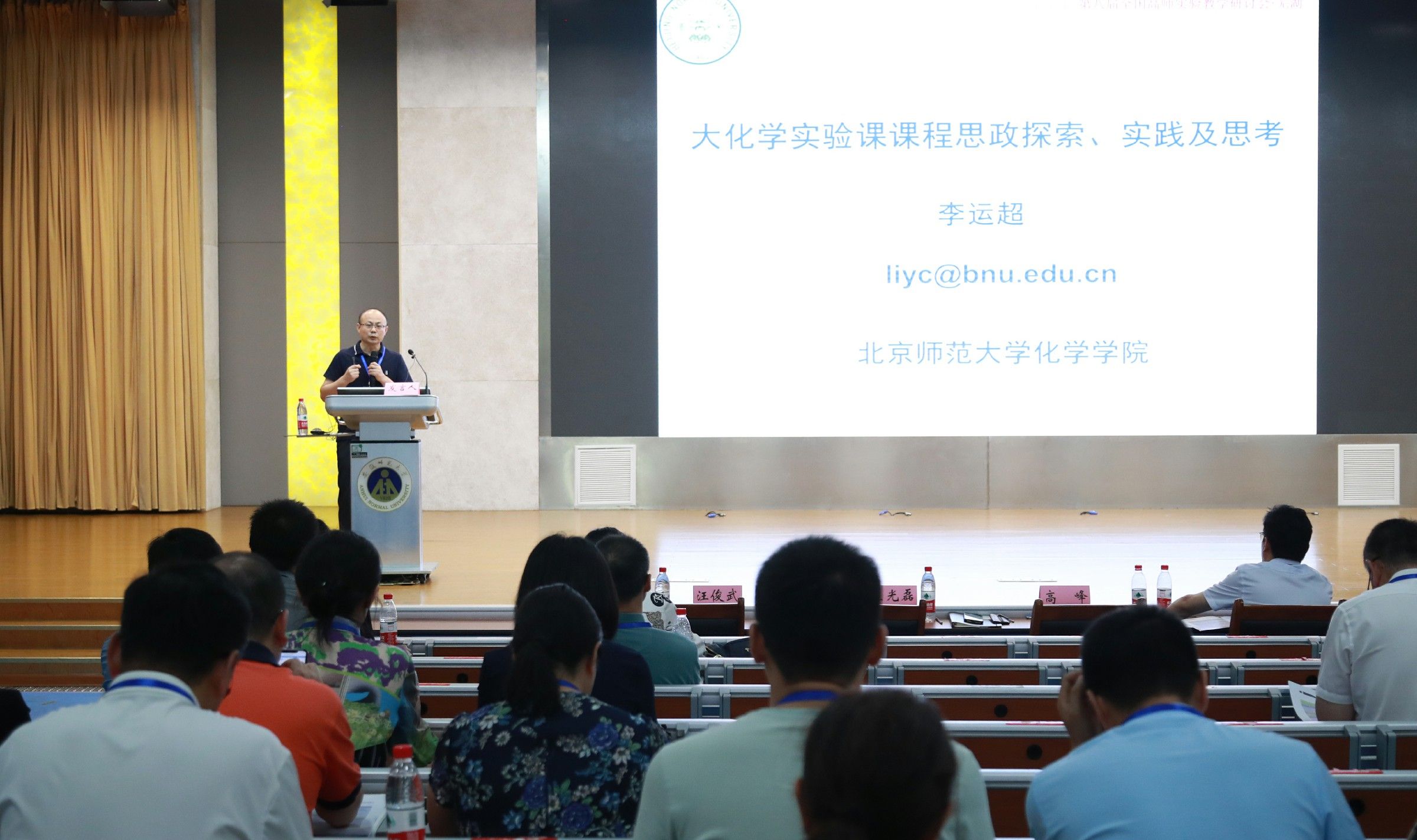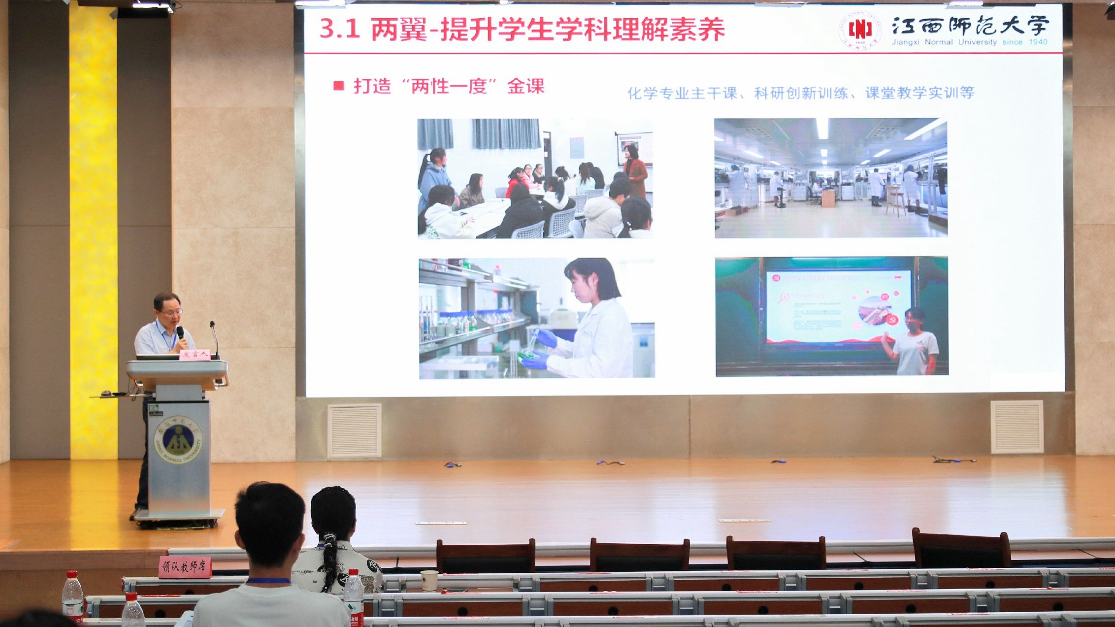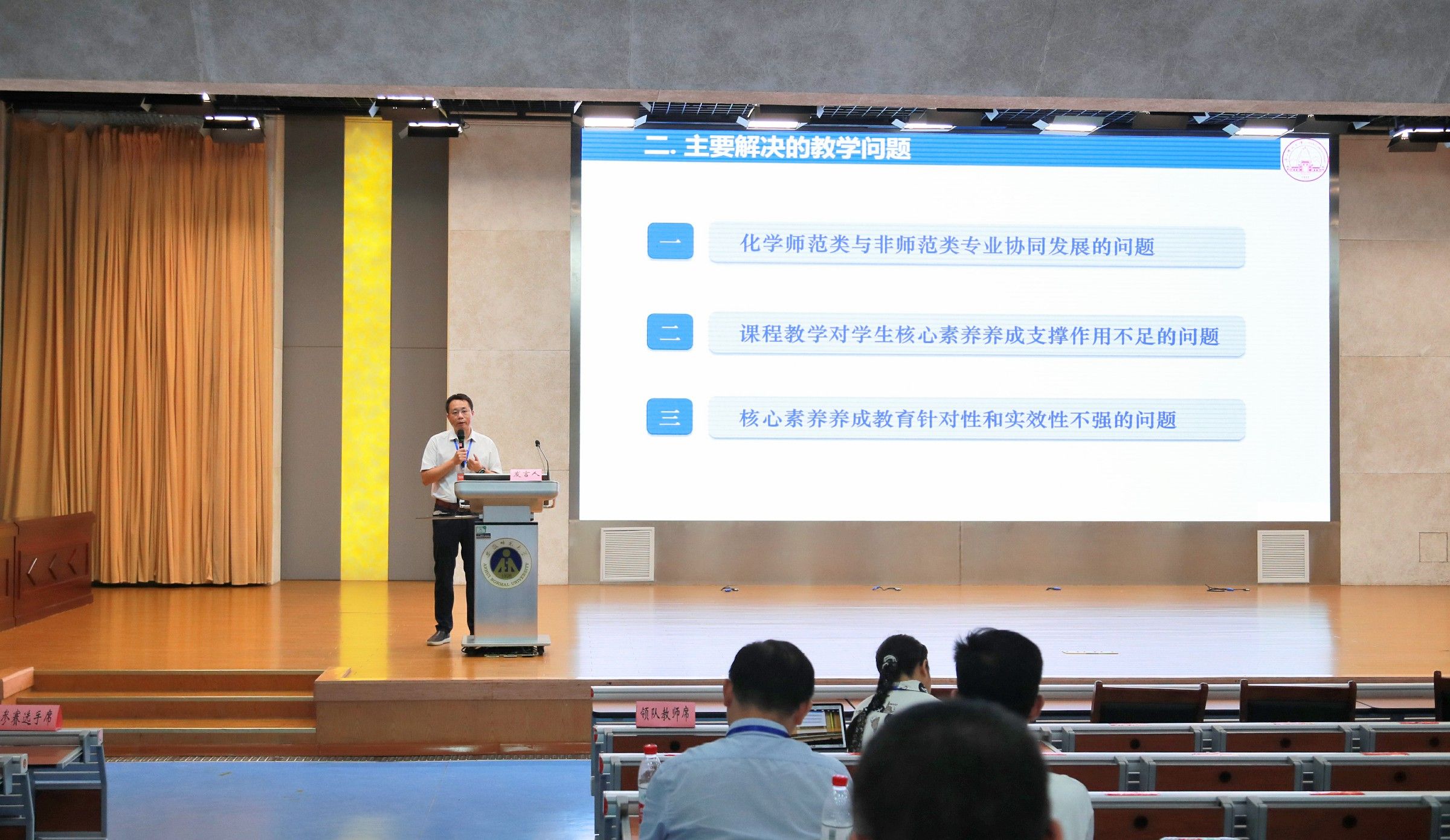 比赛期间,来自全国不同地区、师范院校的知名化学专家先后作了10余场精彩的专题报告,北京师范大学教授李运超做了题为《大学化学实验课程思政探索、实践及思考》的报告;华东师范大学教授王媛媛做了题为《化学一流专业建设举措与思考》的报告;南京师范大学教授苏志做了《早期引导 长期培养 定期评估——构建化学类本科生科研基本素质培养体系》的报告;湖南师范大学教授景一丹做了题为《创新引领 素养提升 情怀培育——湖南师大化学专业“银回收三人组”的成长》的报告;华中师范大学教授原弘做了题为《高等师范院校化学专业本科人才培养的探索与实践》的报告;陕西师范大学教授翟全国做了题为《专业—素质—能力有机融合的无机化学(含实验)课程教学改革与实践》的报告;广西师范大学教授邱建华做了题为《化学一流专业“一核心两主线三保障四途径”人才培养体系构建与实践》的报告;西北师范大学副教授黄静伟做了题为《西北师范大学化学化工学院实验中心建设》的报告;西南大学教授李念兵做了题为《多位一体、虚实协同、关注个性——化学类人才实践创新能力培养模式探索与实践》的报告;江西师范大学教授陶端健做了《以师范专业认证为抓手建设化学一流本科专业》的报告;浙江师范大学副教授宫培军做了题为《关于化学专业(化学+生物科学)复合型硕士层次高中教师培养的浙师实践与思考》的报告。专家们和现场师生就化学实验教学和实验室建设方面进行了深入探讨交流。