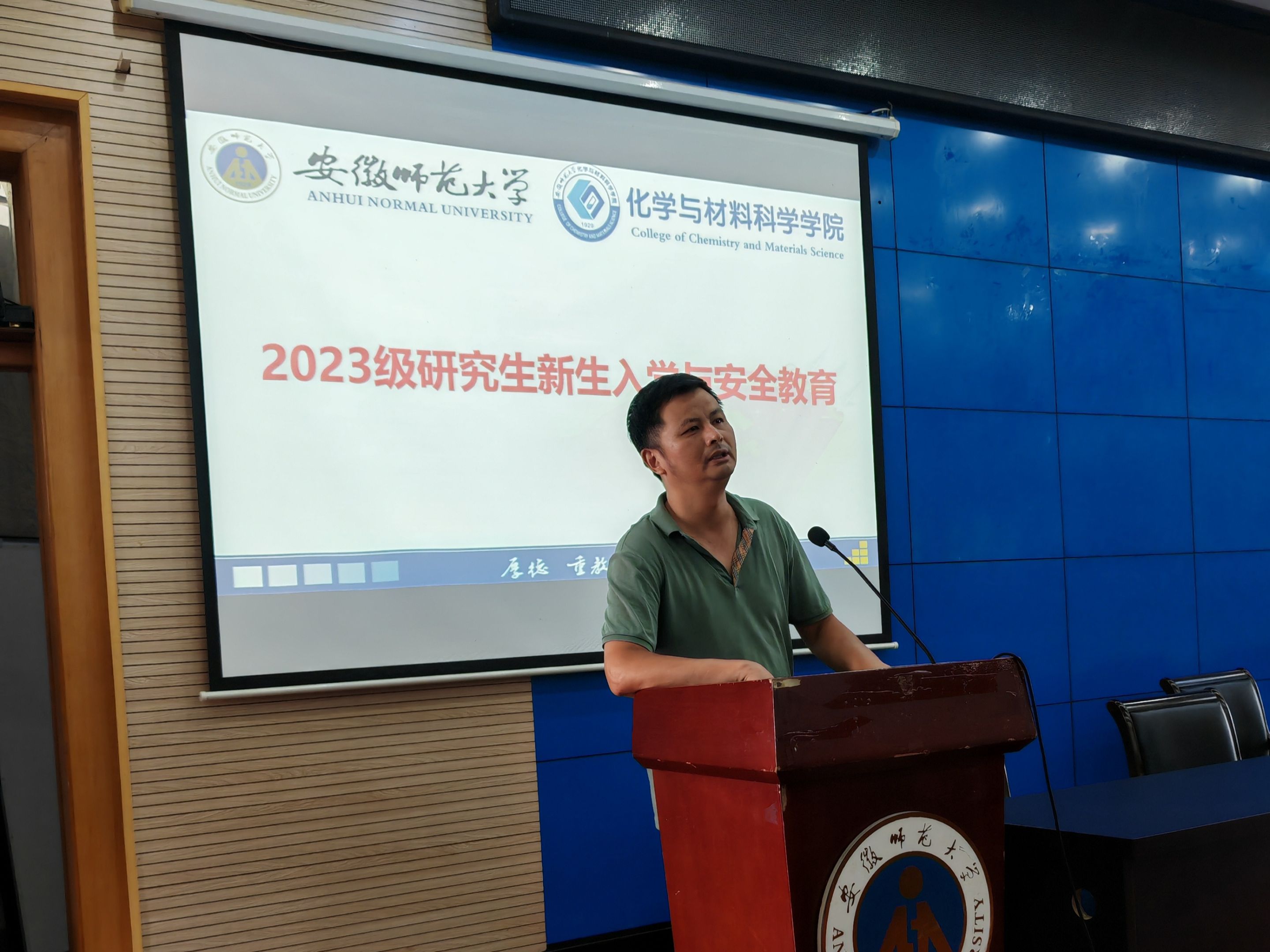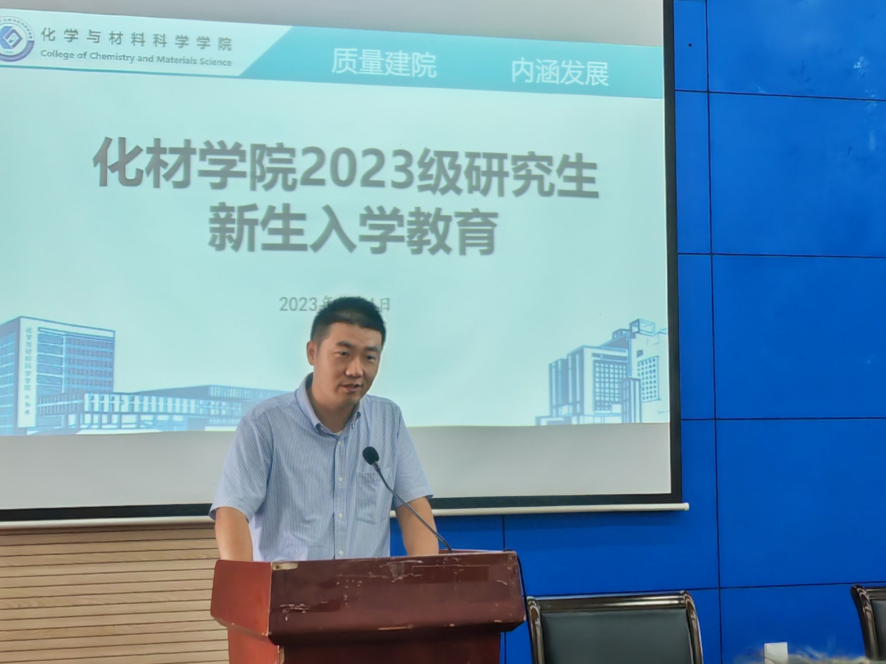 周双六围绕“办学情况、研究生管理制度、研究生科研安全、研究生学习特点与要求”四个层面向同学们进行了深入且详细的介绍,从专业建设、学科建设、队伍建设、文化建设等方面,展开介绍了化材院各专业的硬件条件和人才培养成效。随后,解读了《研究生管理制度与规定》和《安徽师范大学研究生学籍管理办法》相关内容,再次强调实验室安全的重要性。此外,周双六希望2023级研究生做好角色转变,远离舒适圈,永葆锐气和长时间的投入,做好自我管理,使研究生生涯学有所成、学有所获、生活愉快。