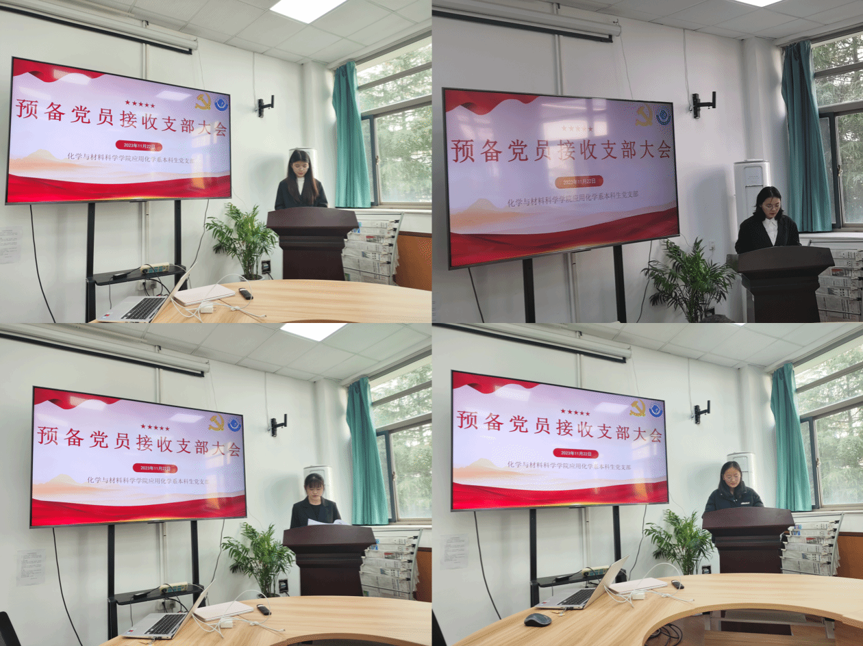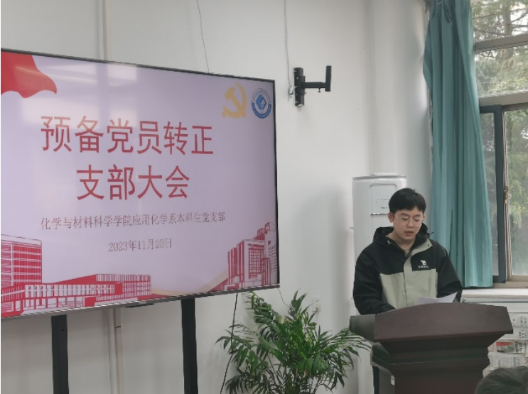 应化系本科生党支部在学苑北楼204会议室召开党支部大会,开展理论学习,讨论苏良建、朱会凌2名预备党员转正、接收于素芳等4名同志为预备党员相关事宜。会议由党支部书记王芳同志主持。本次支部大会应到会党员12人,实到会党员11人,其中正式党员4人,1位预备党员因课请假,党员人数符合组织规定。